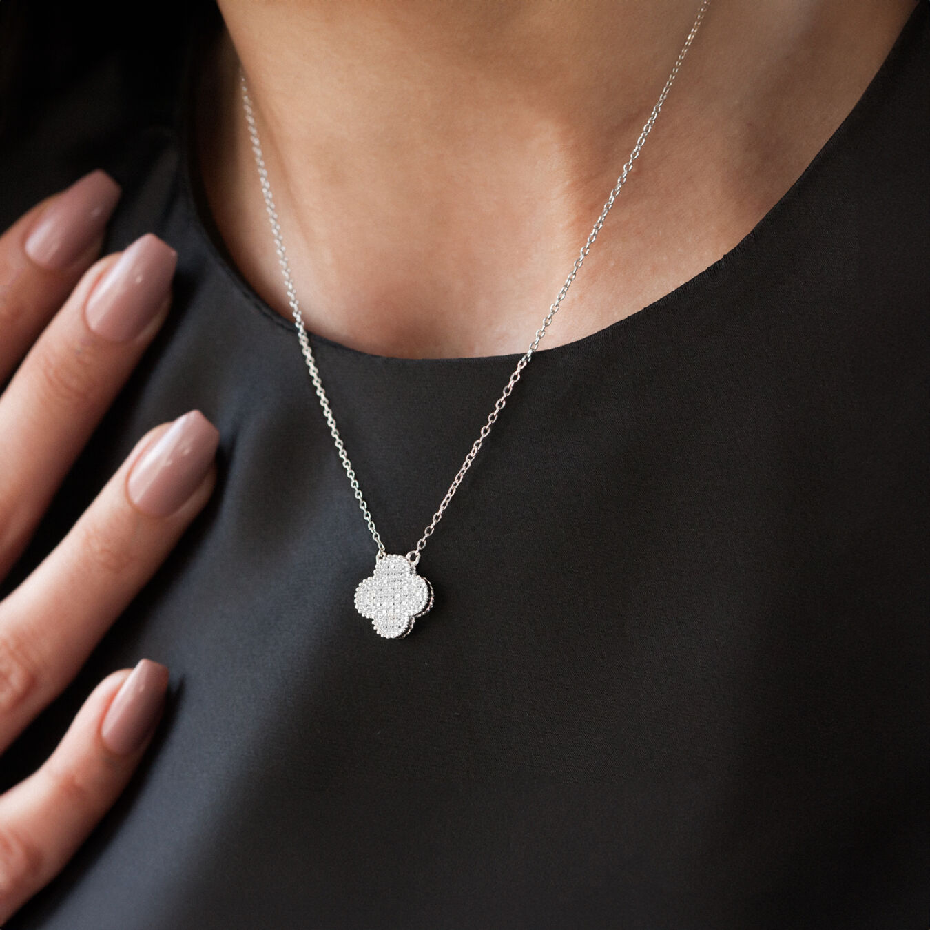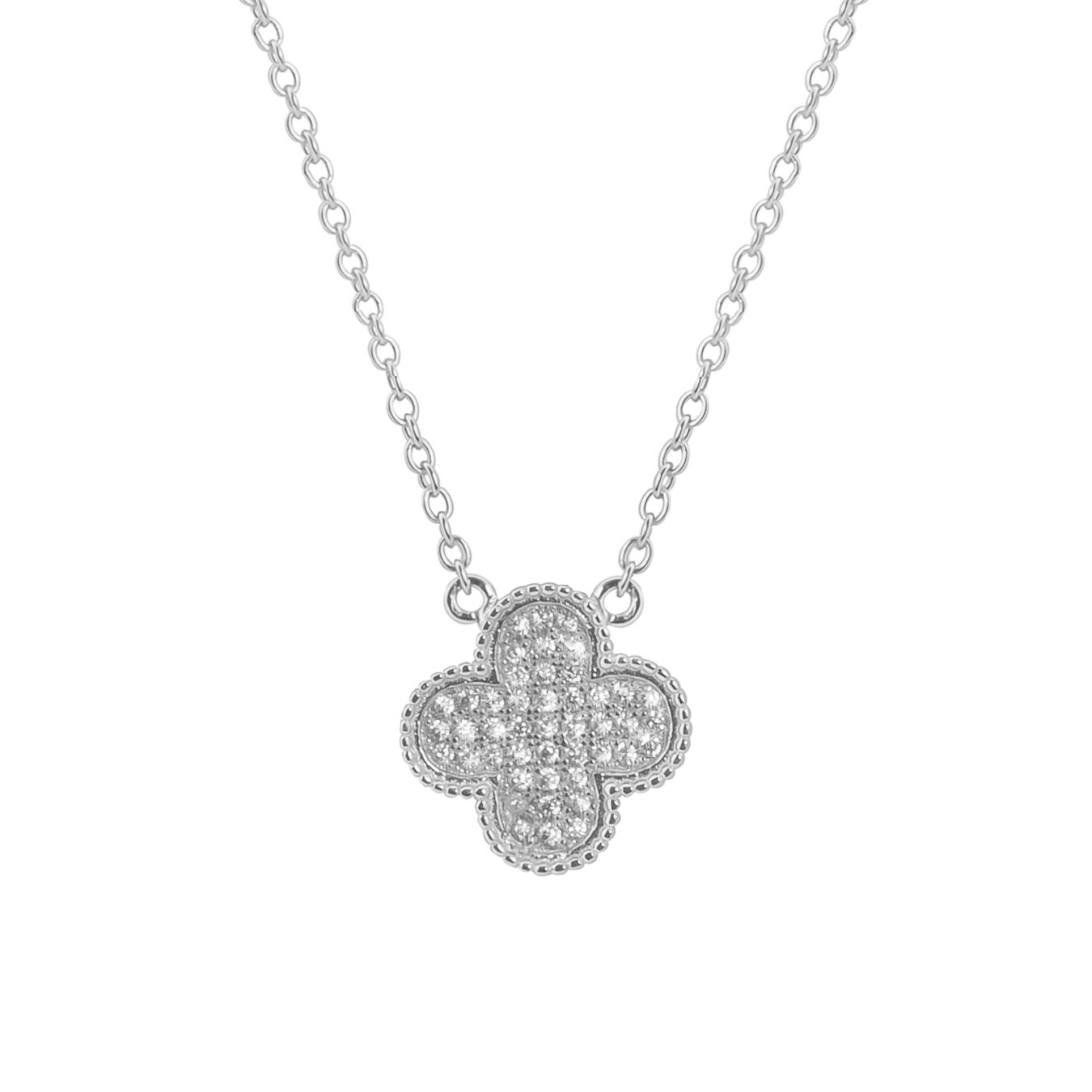 Carry a touch of good luck wherever you go. Our sterling silver pave CZ clover necklace features the classic four-leaf shape. It has been set with a shimmering field of bright Cubic Zirconia stones.