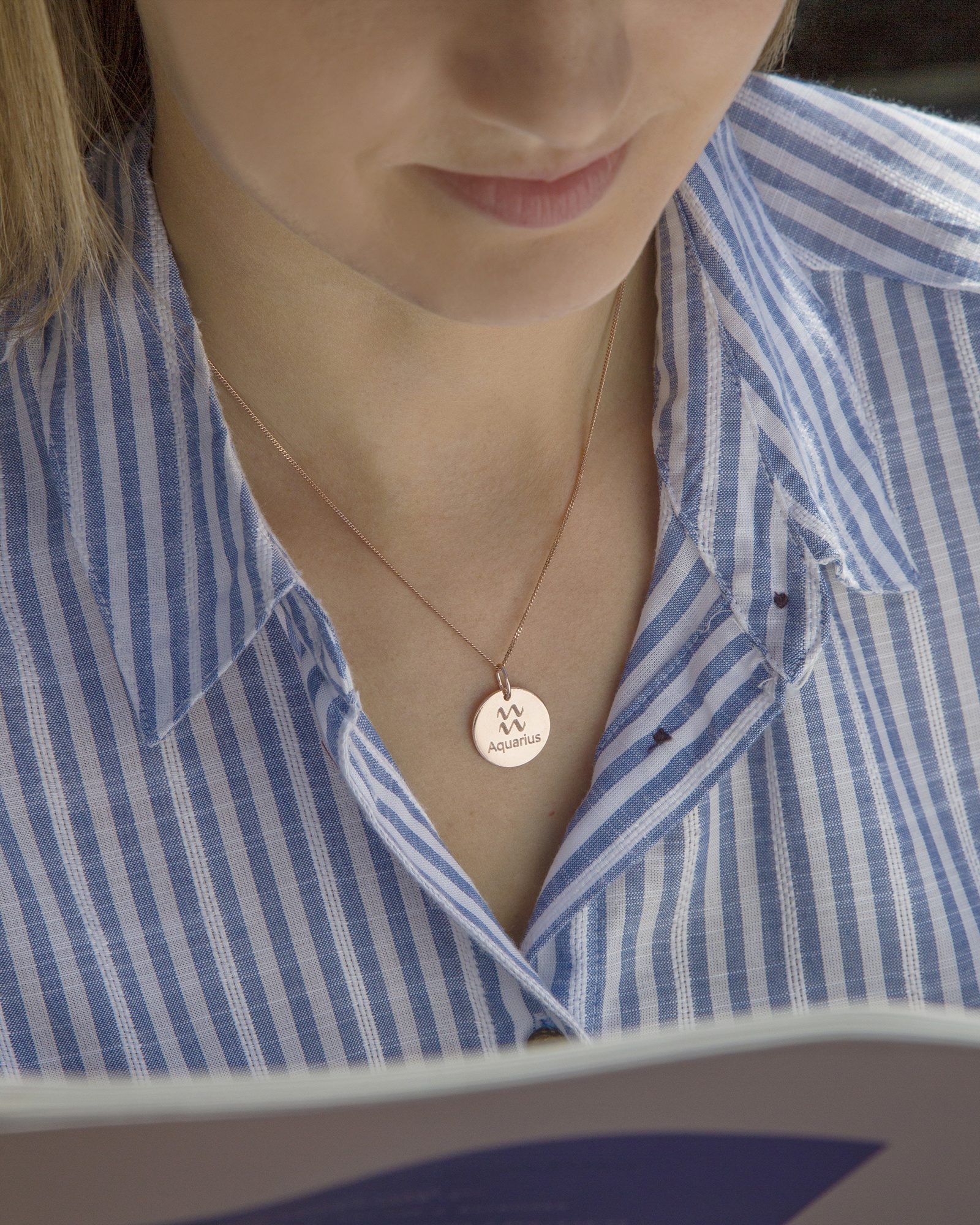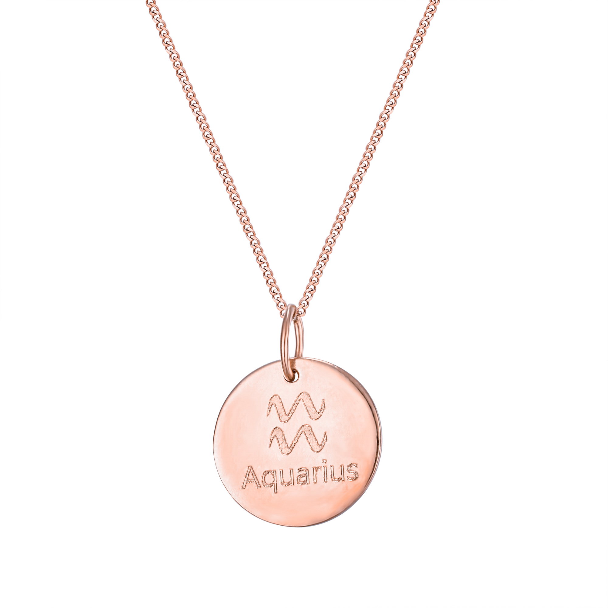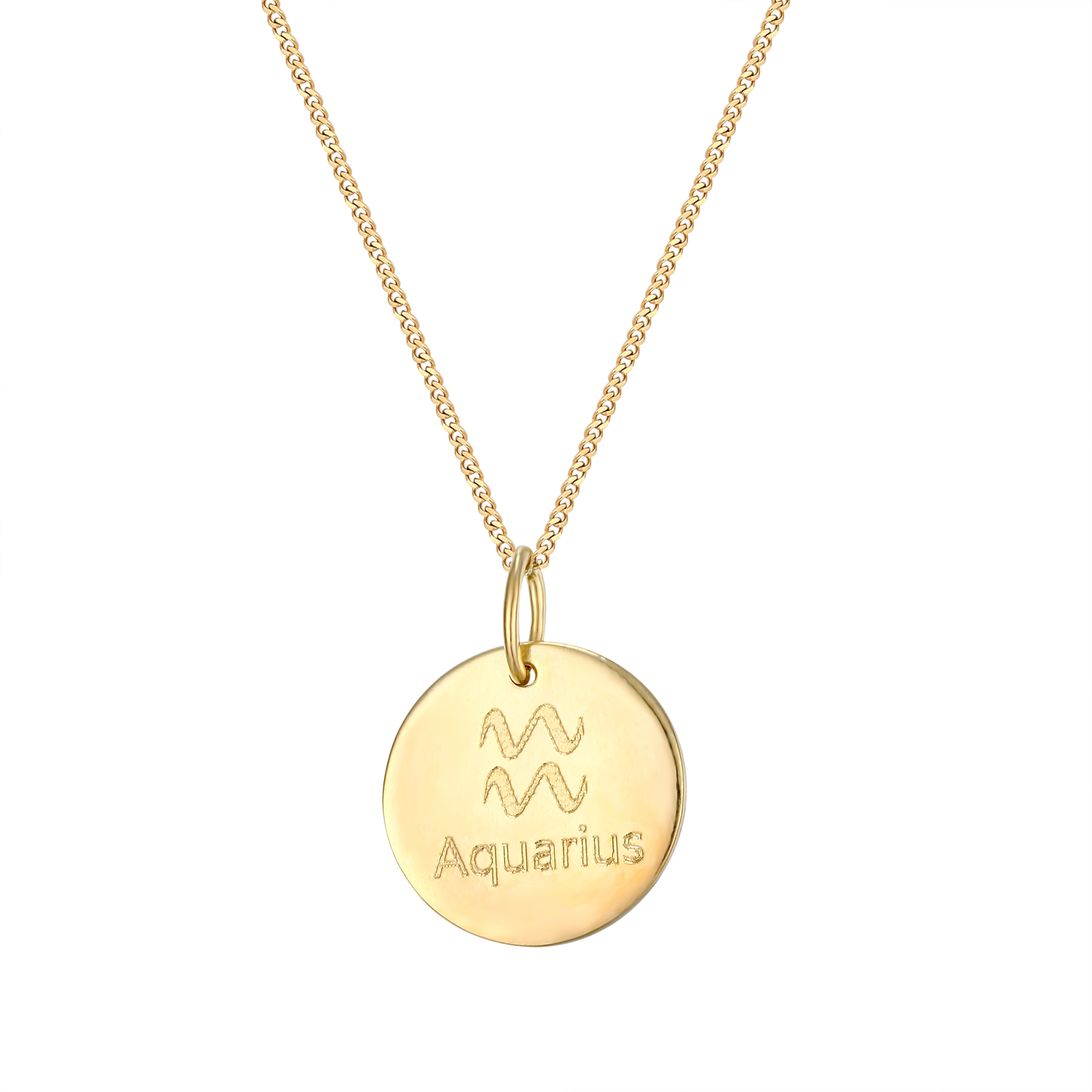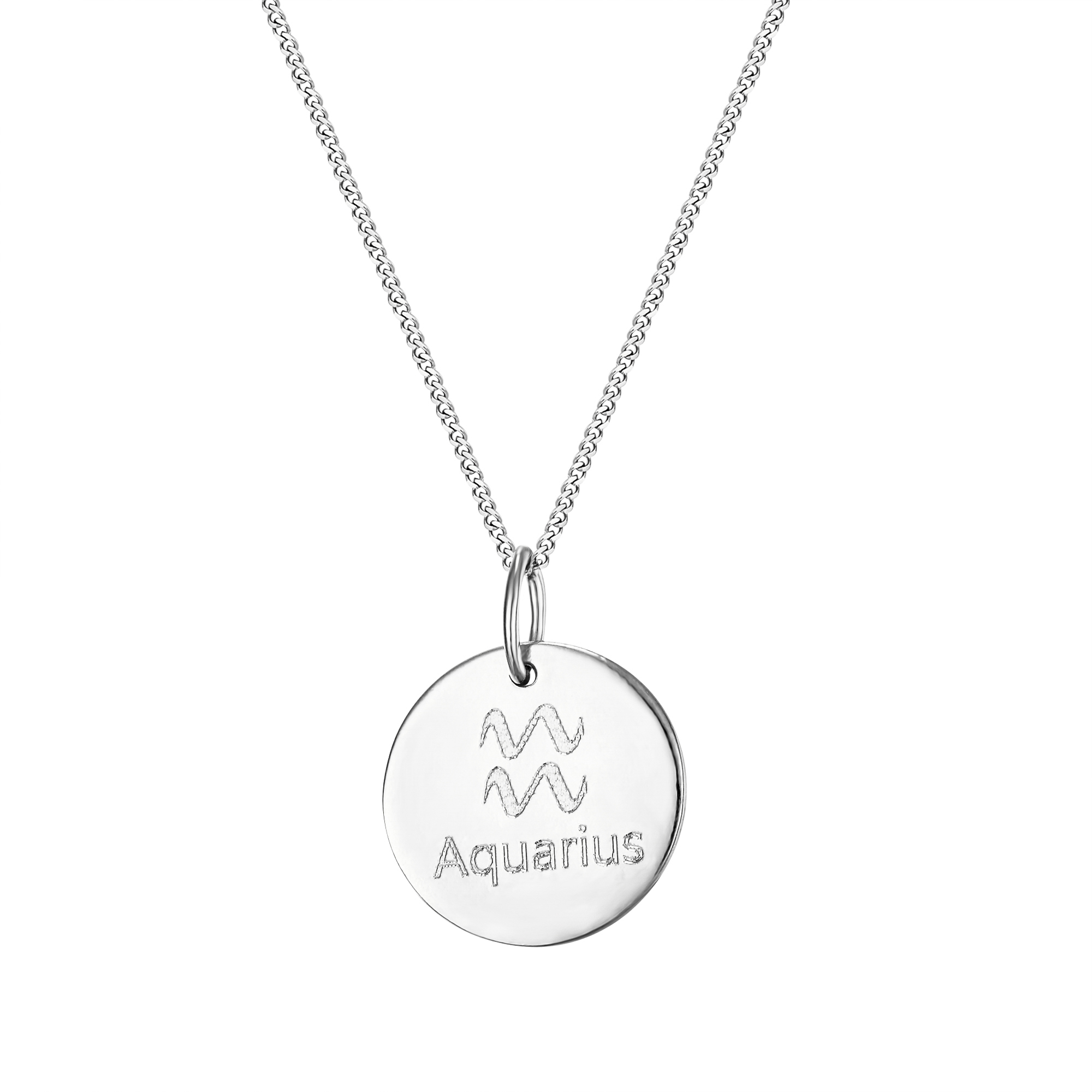 Personalised sterling silver Aquarius star sign disc pendant. Available in sterling silver (.925), 18ct yellow gold plate over sterling silver (.925) or 18ct rose gold plate over sterling silver (.925).