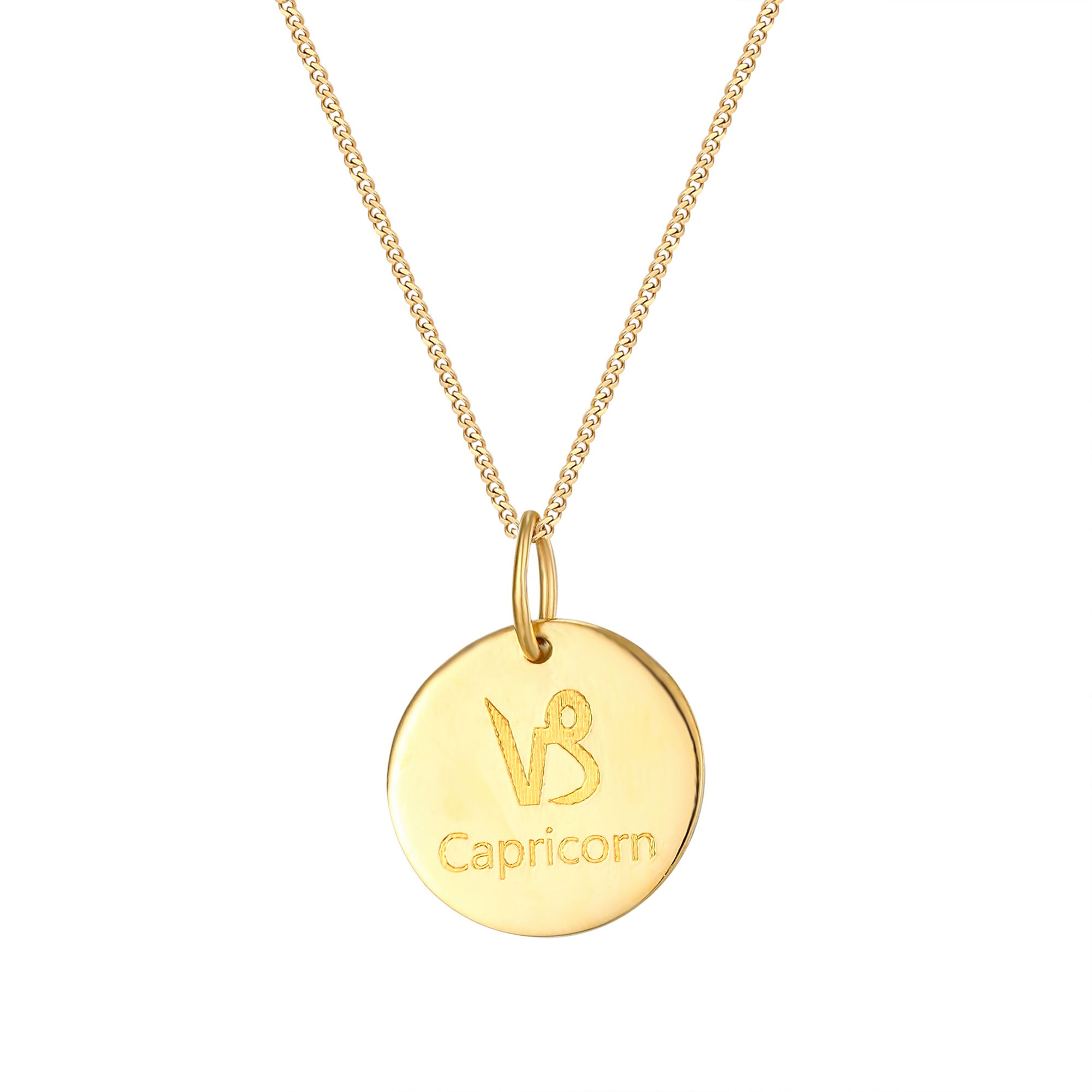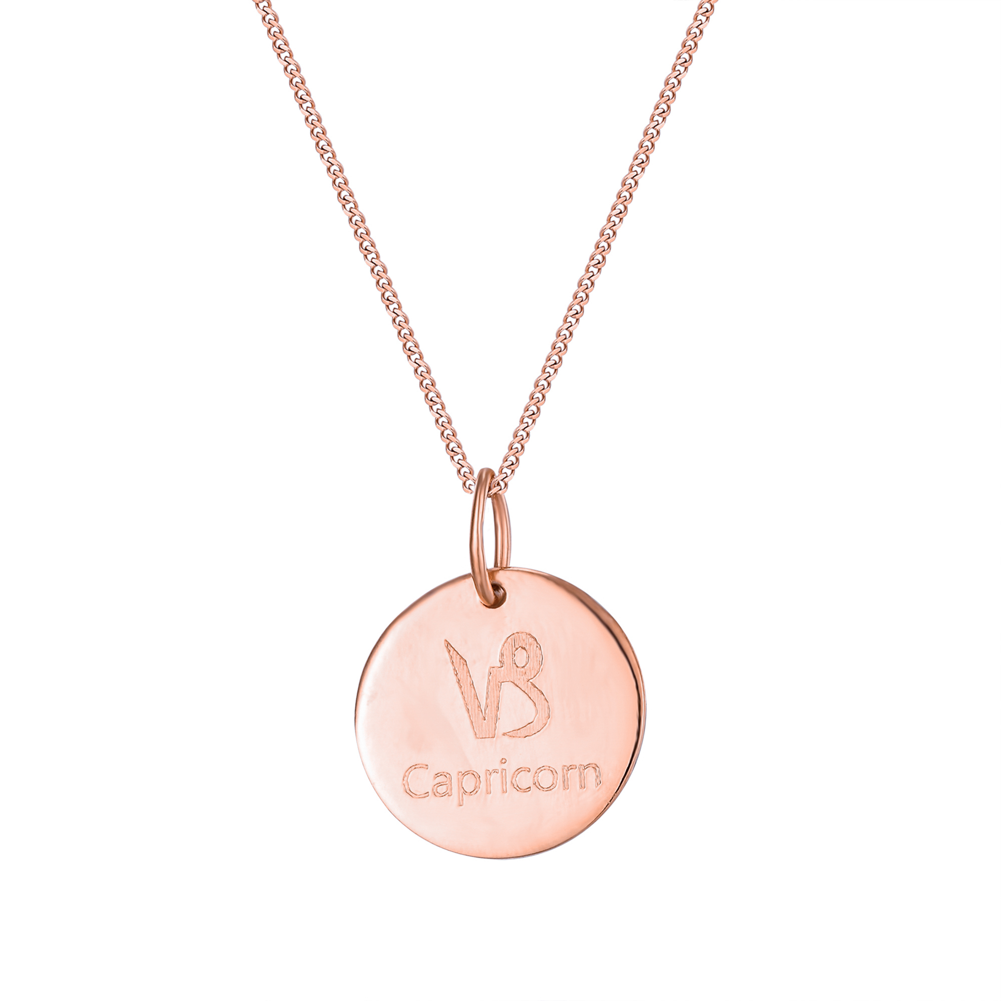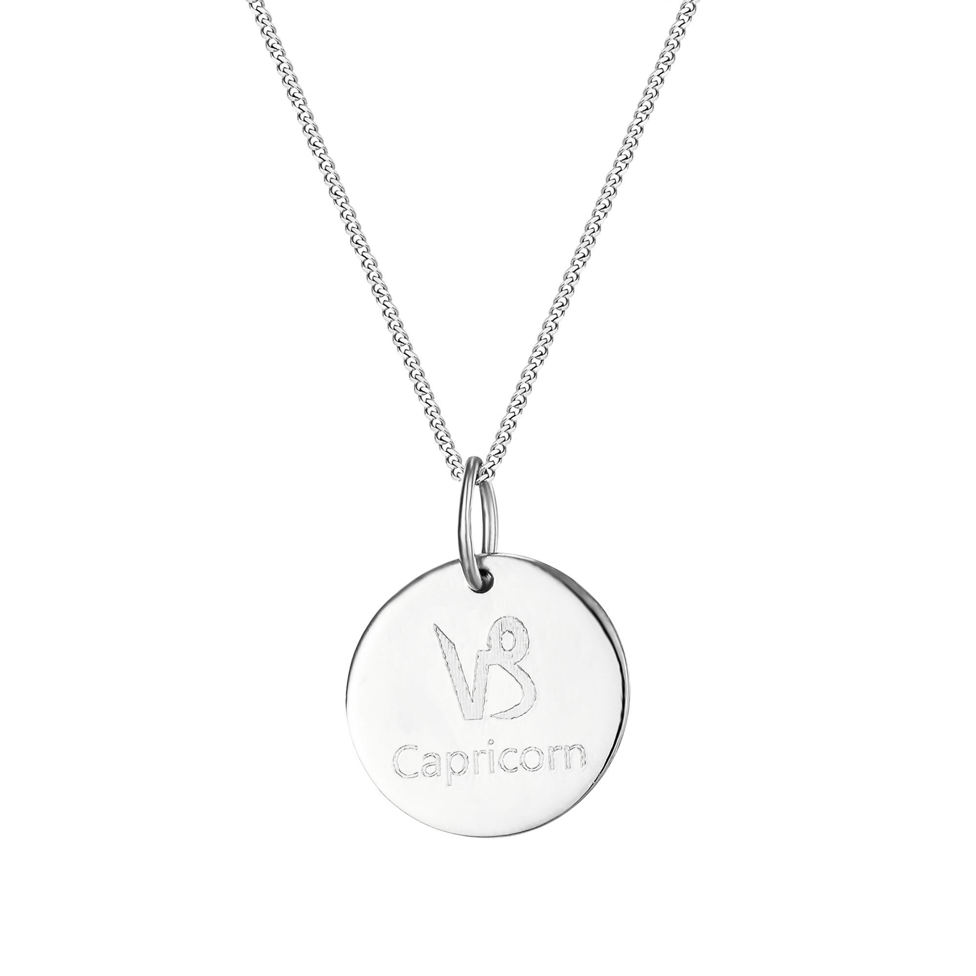 Personalised sterling silver Capricorn star sign disc pendant. Available in sterling silver (.925), 18ct yellow gold plate over sterling silver (.925) or 18ct rose gold plate over sterling silver (.925).