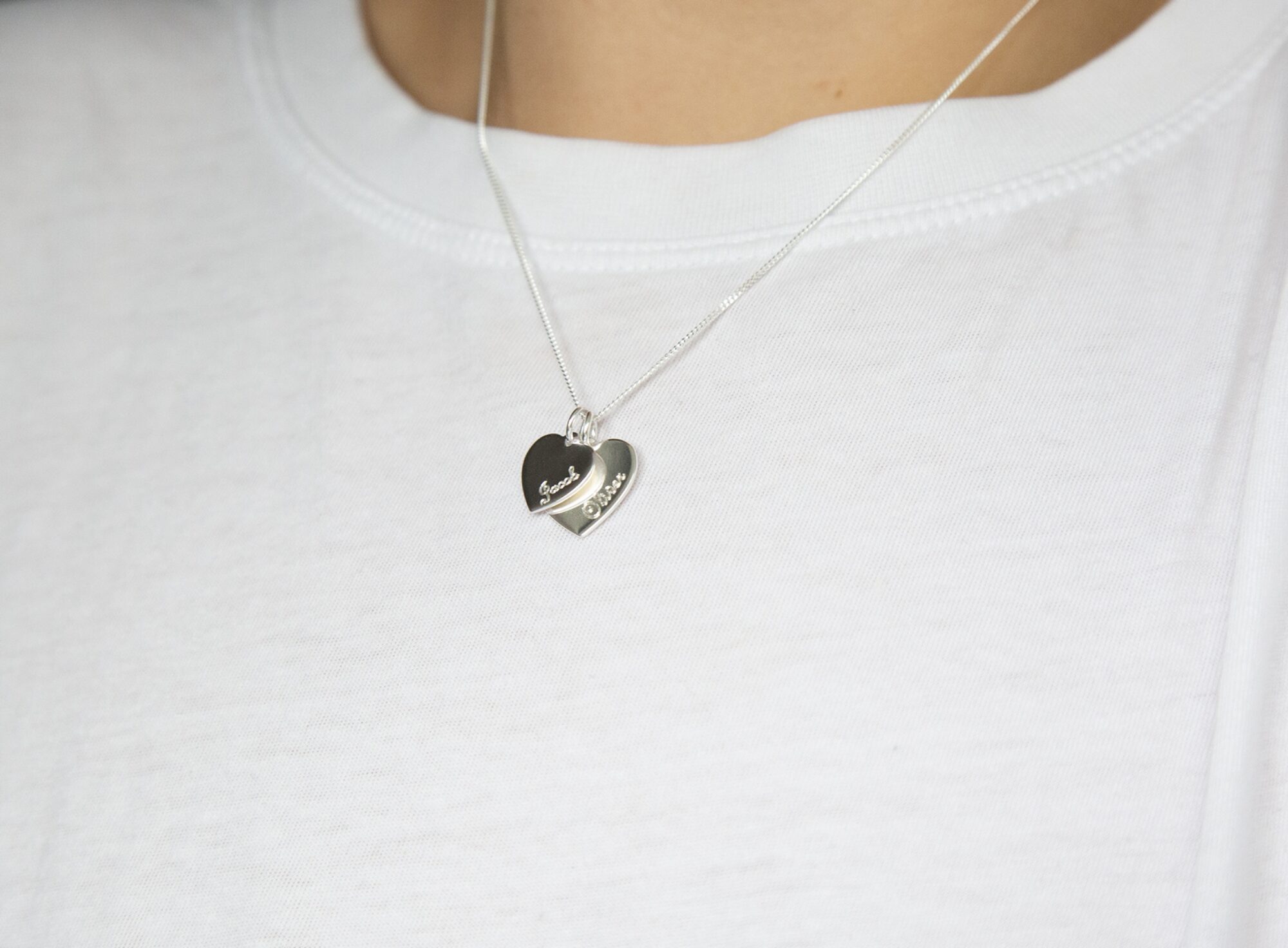 Sterling silver (.925) personalised layered heart pendant. Available in sterling silver (.925), 18ct yellow gold plate over sterling silver (.925) or 18ct rose gold plate over sterling silver (.925).