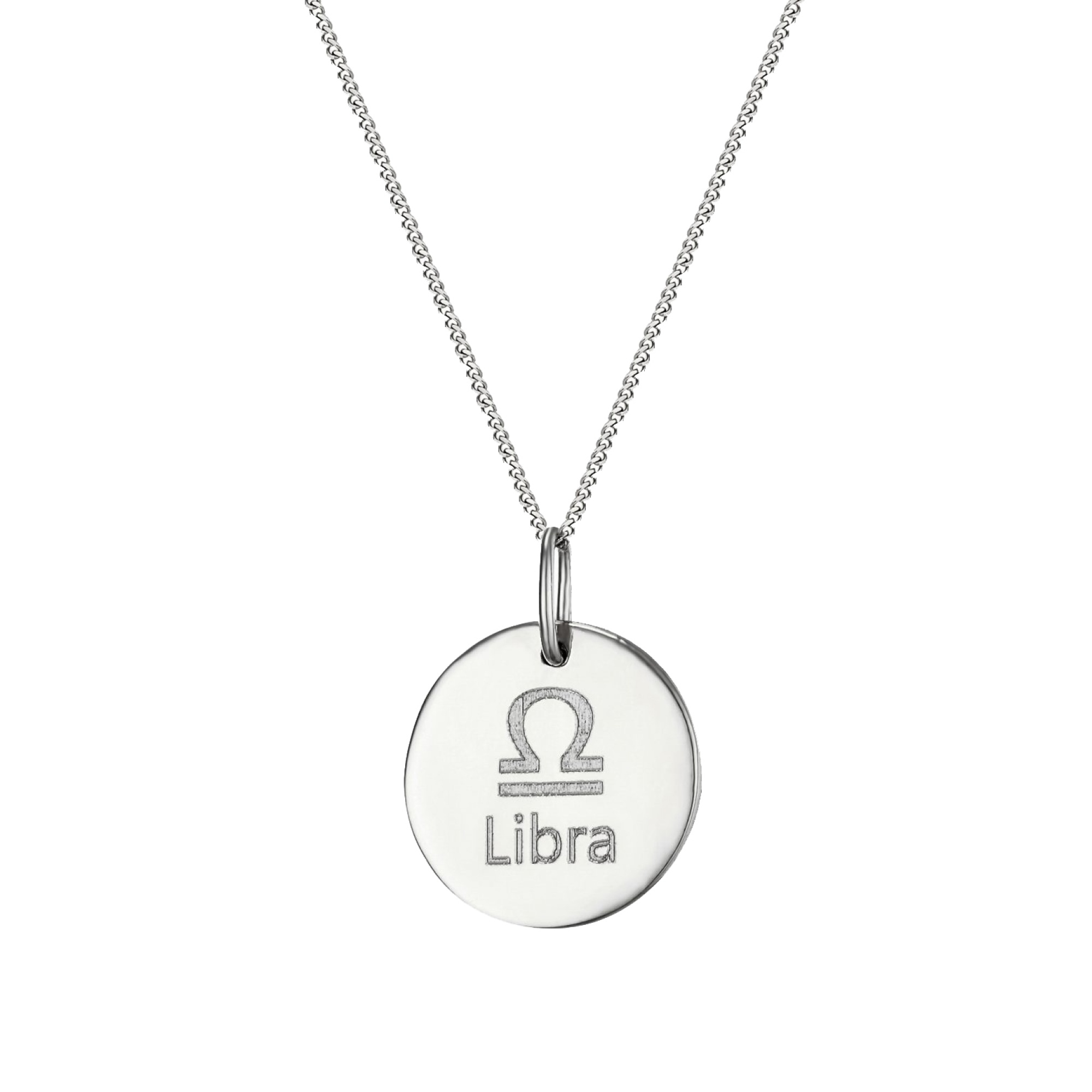 Personalised sterling silver Libra star sign disc pendant. Available in sterling silver (.925), 18ct yellow gold plate over sterling silver (.925) or 18ct rose gold plate over sterling silver (.925).