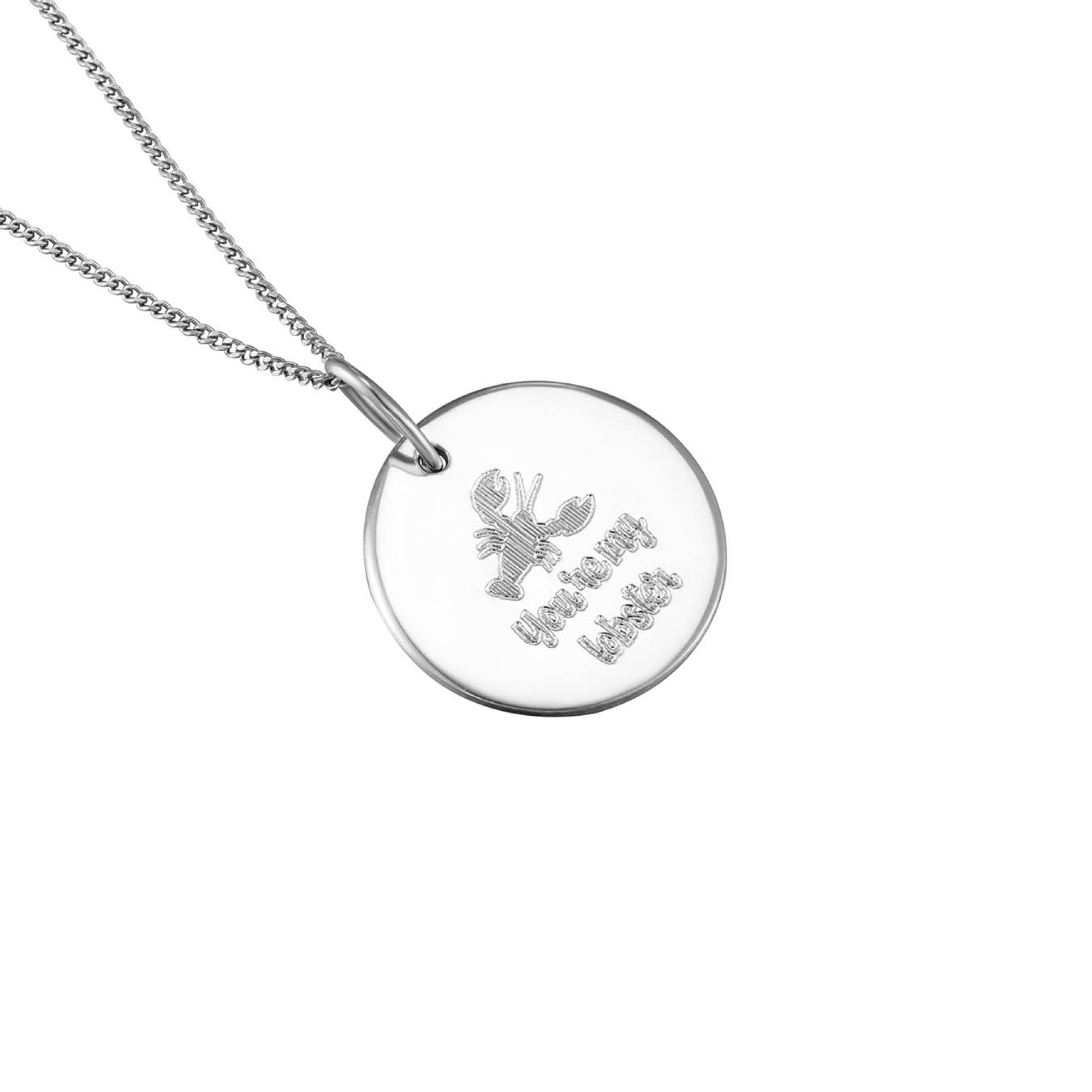 Sterling silver (.925) disc pendant engraved with ‘You’re my Lobster’. Available in sterling silver (.925), 18ct yellow gold plate over sterling silver (.925) or 18ct rose gold plate over sterling silver (.925).