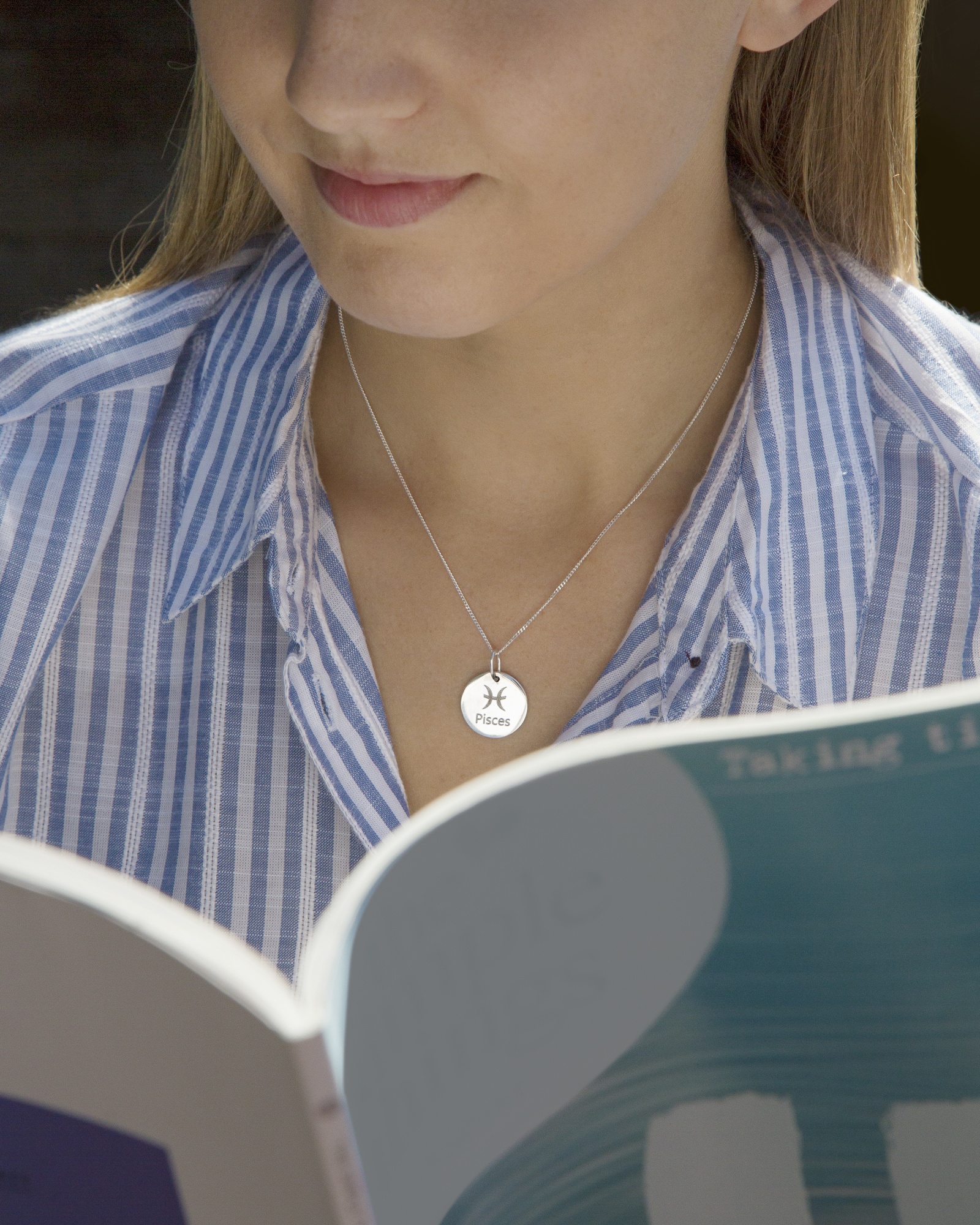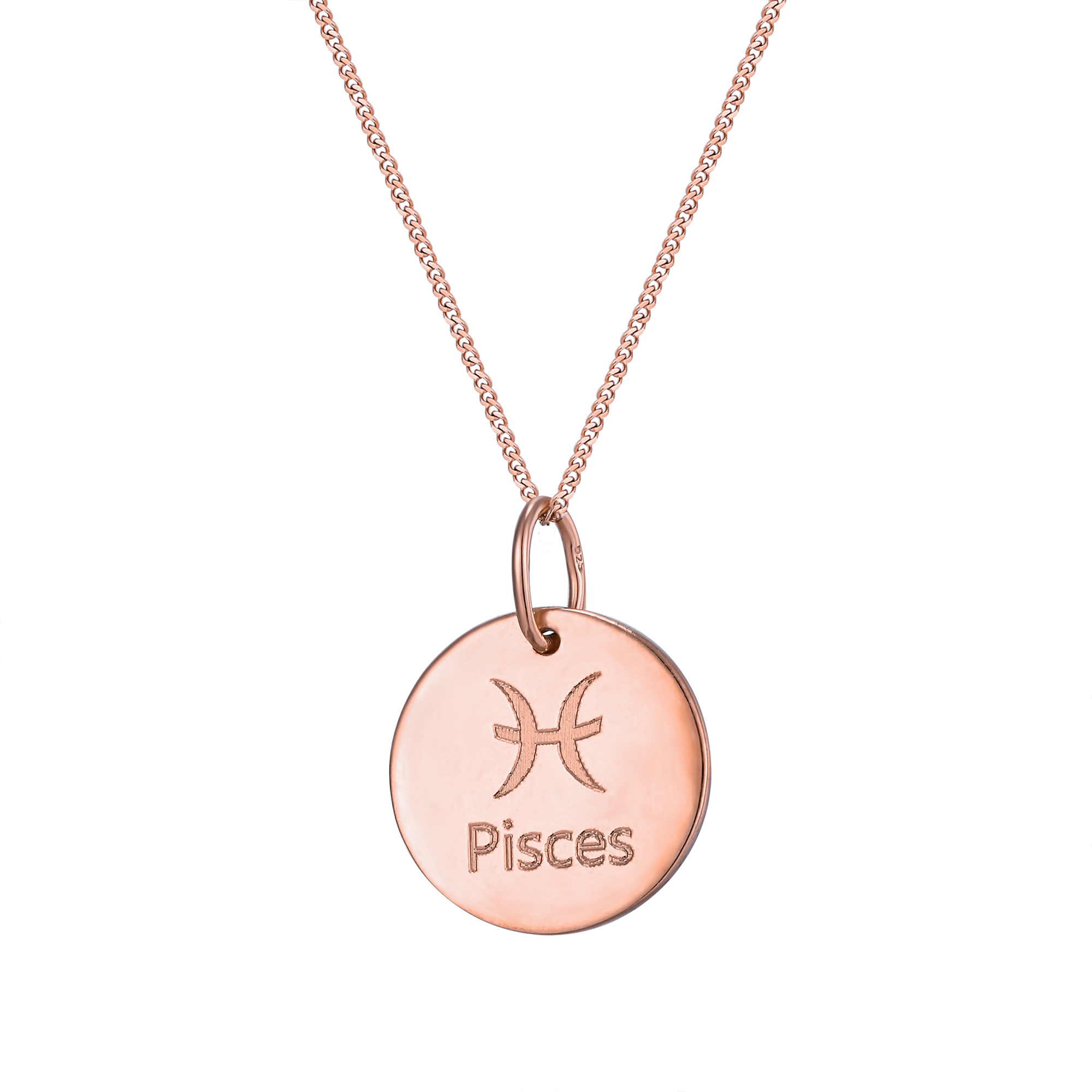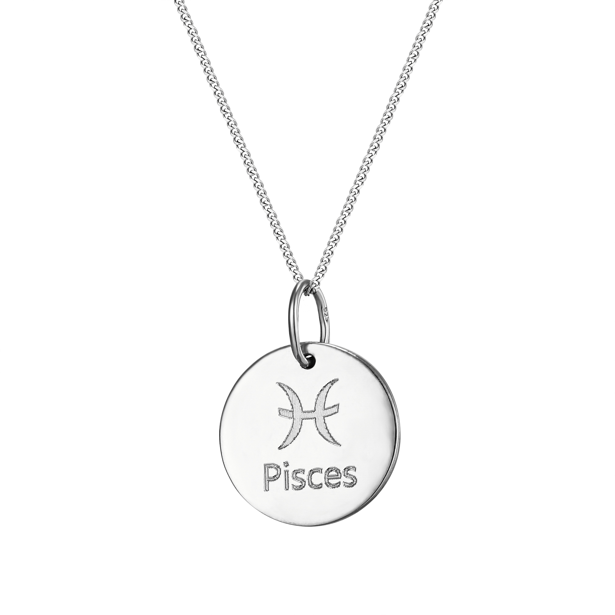 Personalised sterling silver Pisces star sign disc pendant. Available in sterling silver (.925), 18ct yellow gold plate over sterling silver (.925) or 18ct rose gold plate over sterling silver (.925).