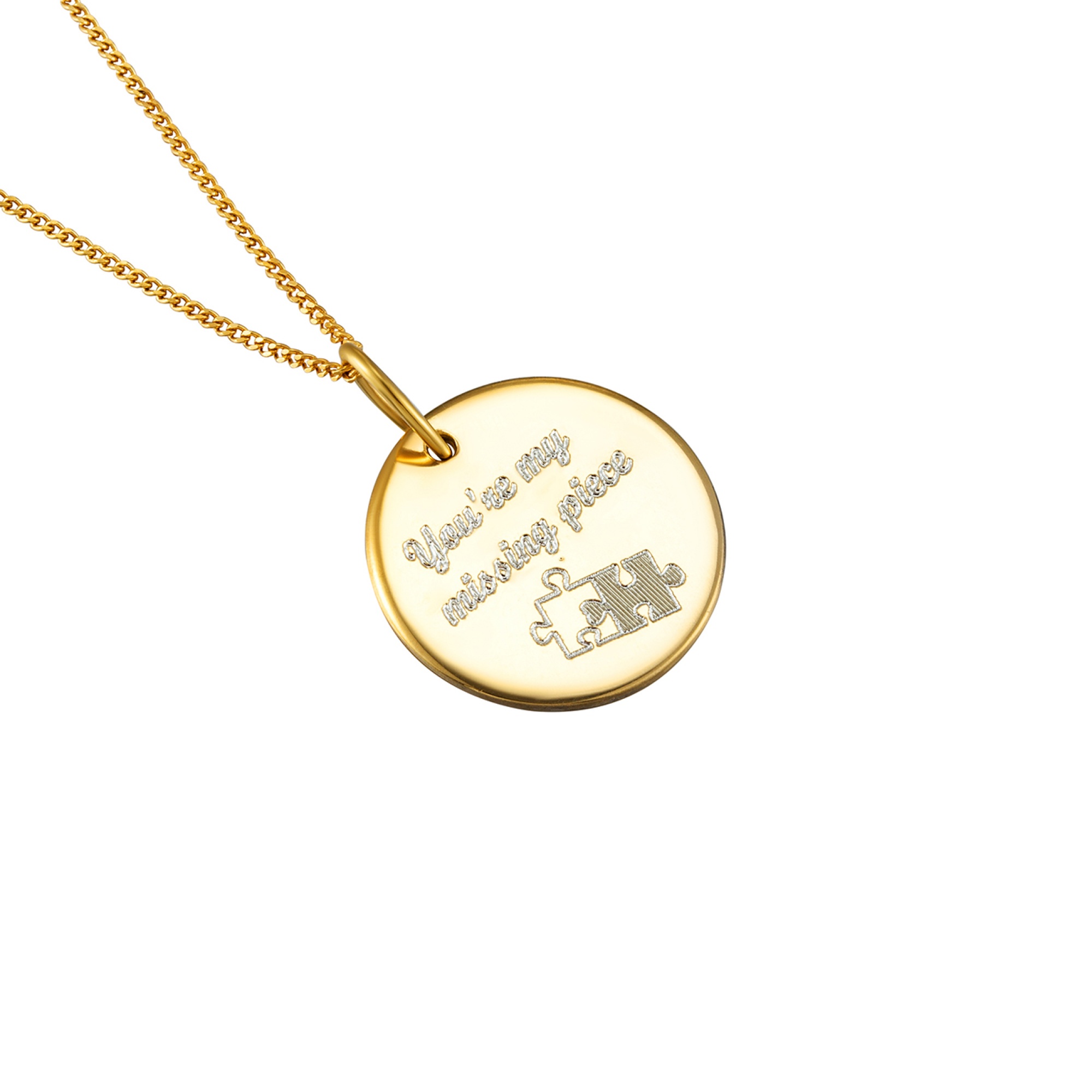Sterling silver (.925) disc pendant engraved with puzzle Piece. Available in sterling silver (.925), 18ct yellow gold plate over sterling silver (.925) or 18ct rose gold plate over sterling silver (.925).