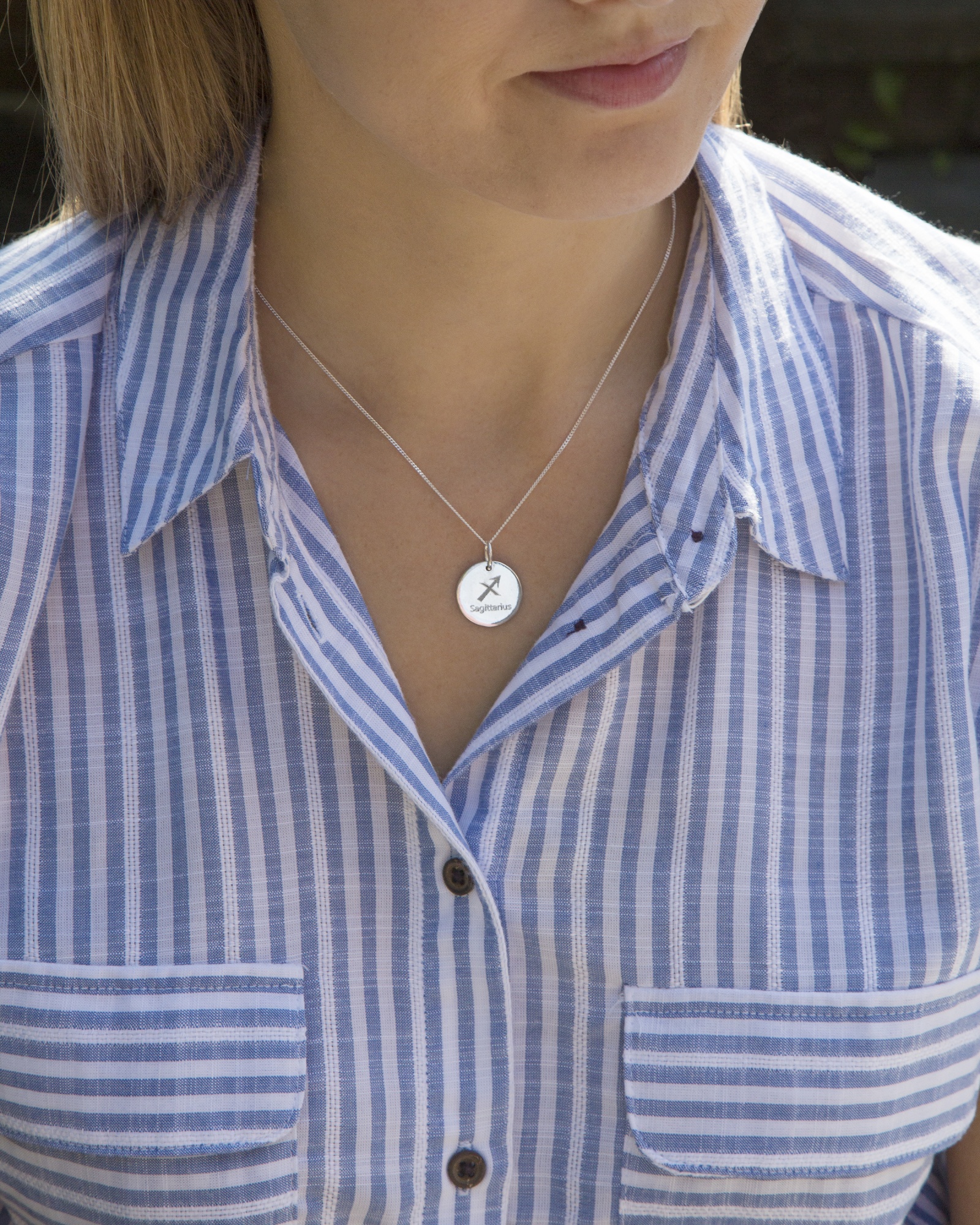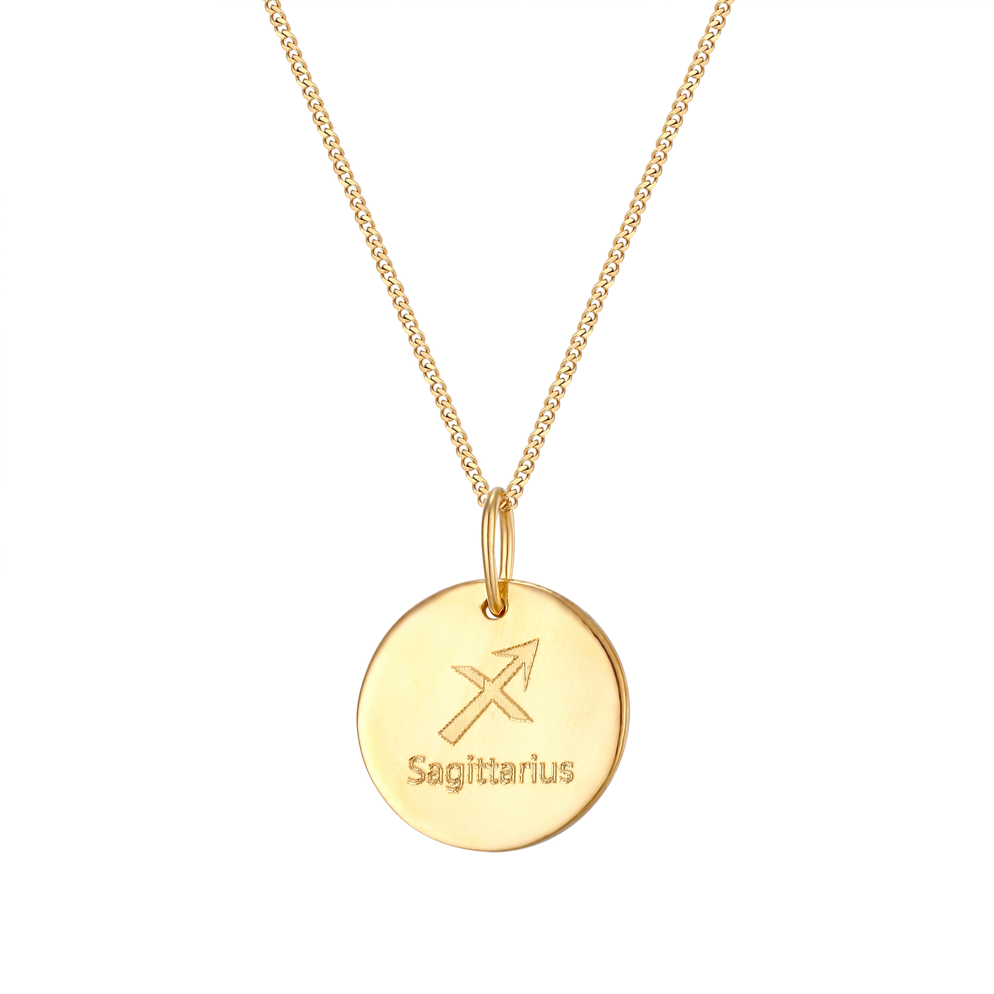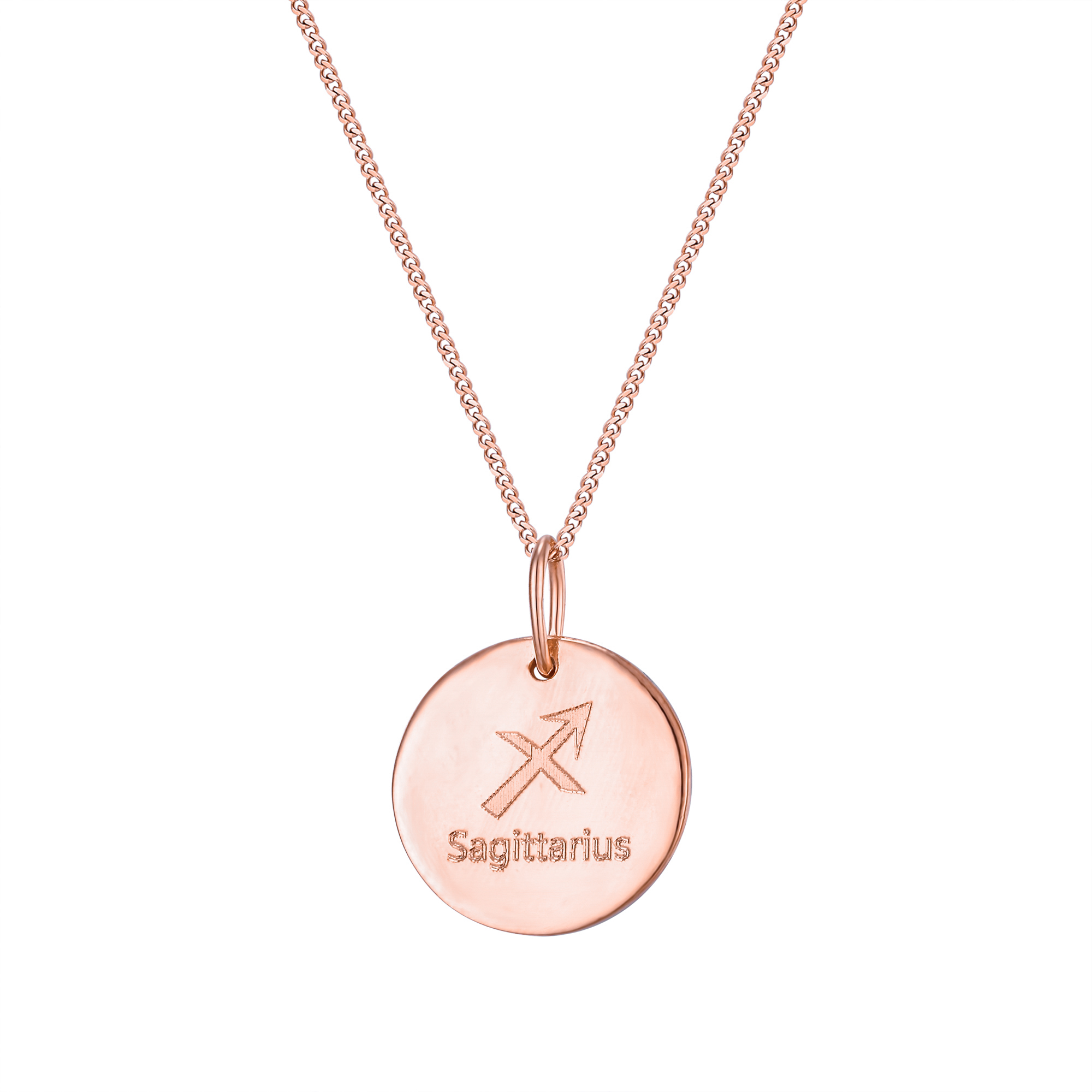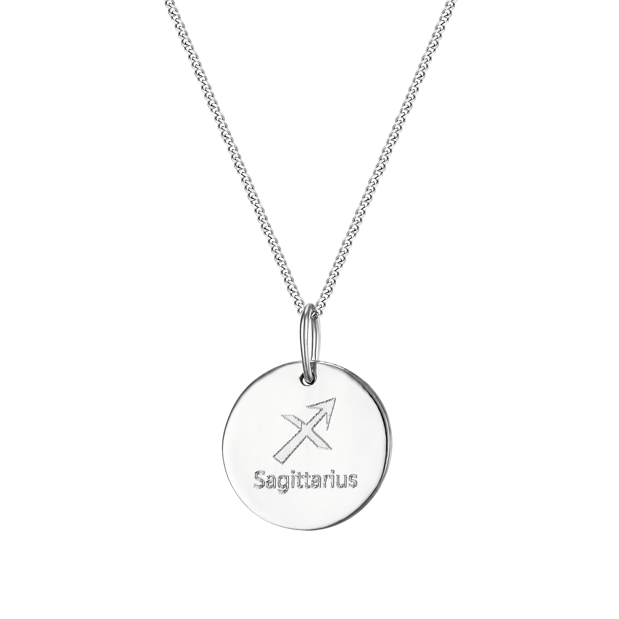 Personalised sterling silver Sagittarius star sign disc pendant. Available in sterling silver (.925), 18ct yellow gold plate over sterling silver (.925) or 18ct rose gold plate over sterling silver (.925).