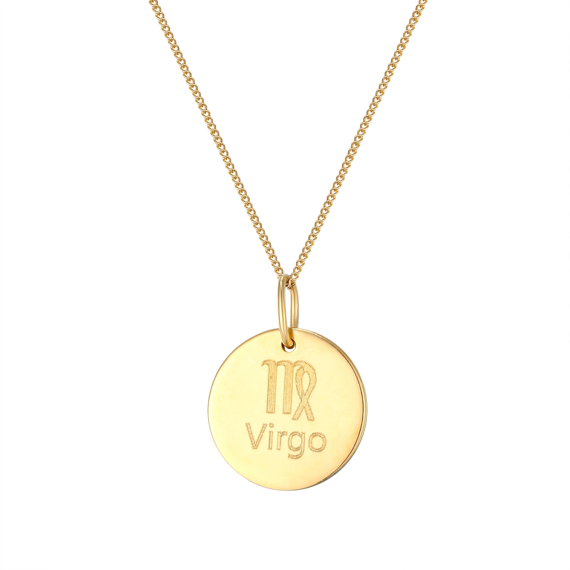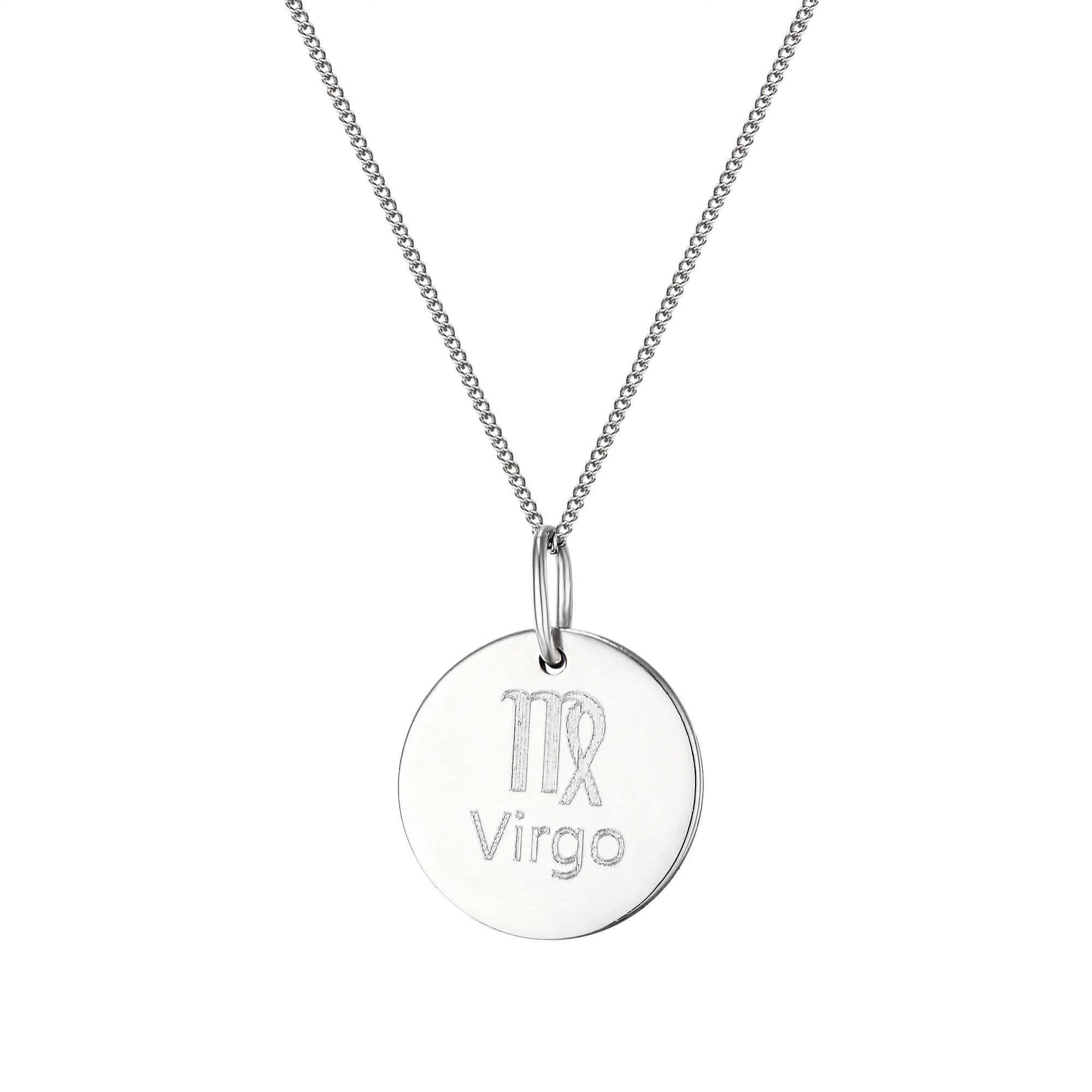 Personalised sterling silver Virgo star sign disc pendant. Available in sterling silver (.925), 18ct yellow gold plate over sterling silver (.925) or 18ct rose gold plate over sterling silver (.925).
