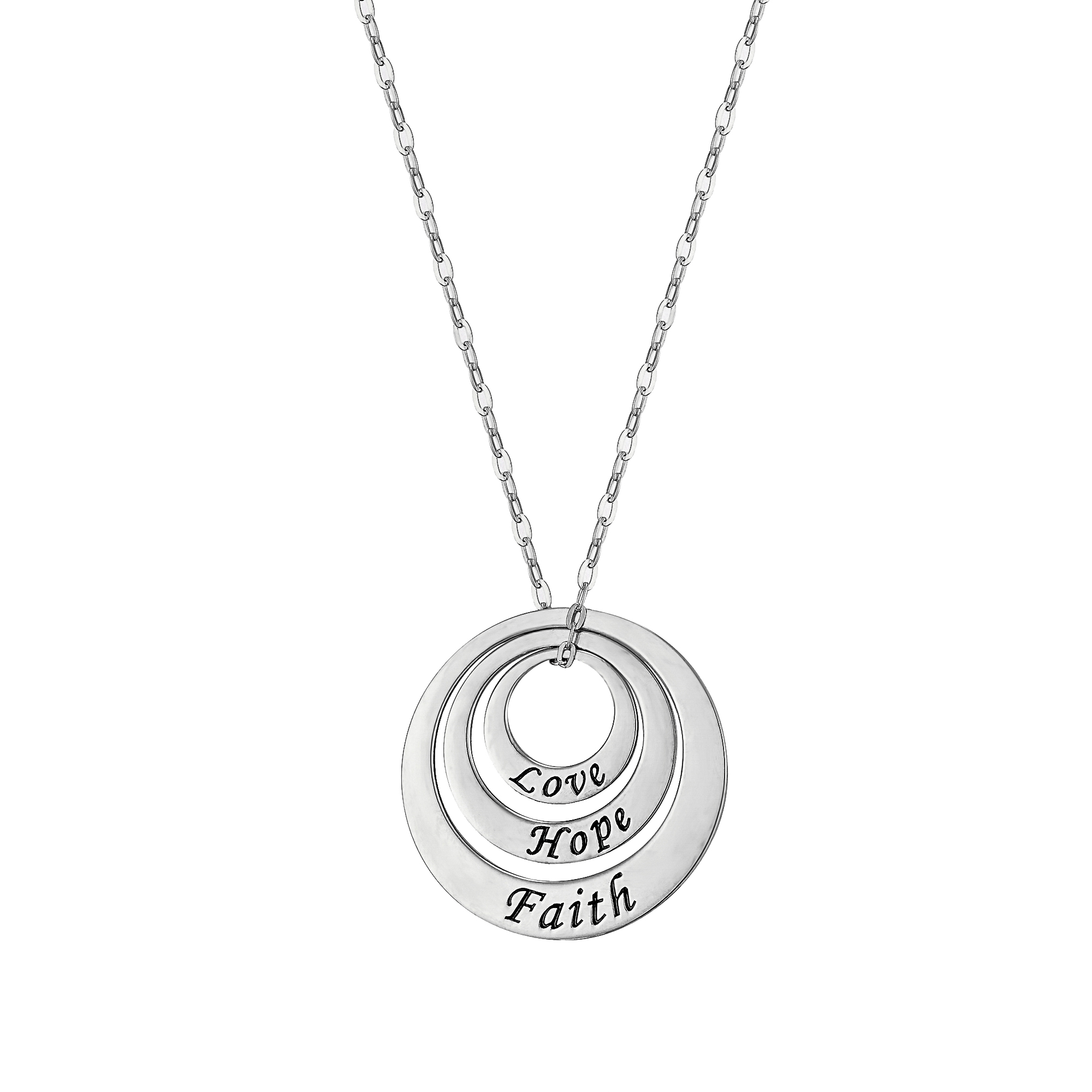 Sterling Silver three-disc love, hope, faith necklace. Available in sterling silver (.925), 18ct yellow gold plate over sterling silver (.925) or 18ct rose gold plate over sterling silver (.925).