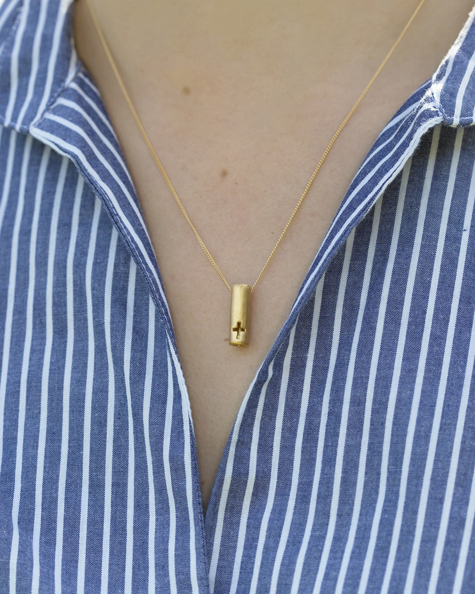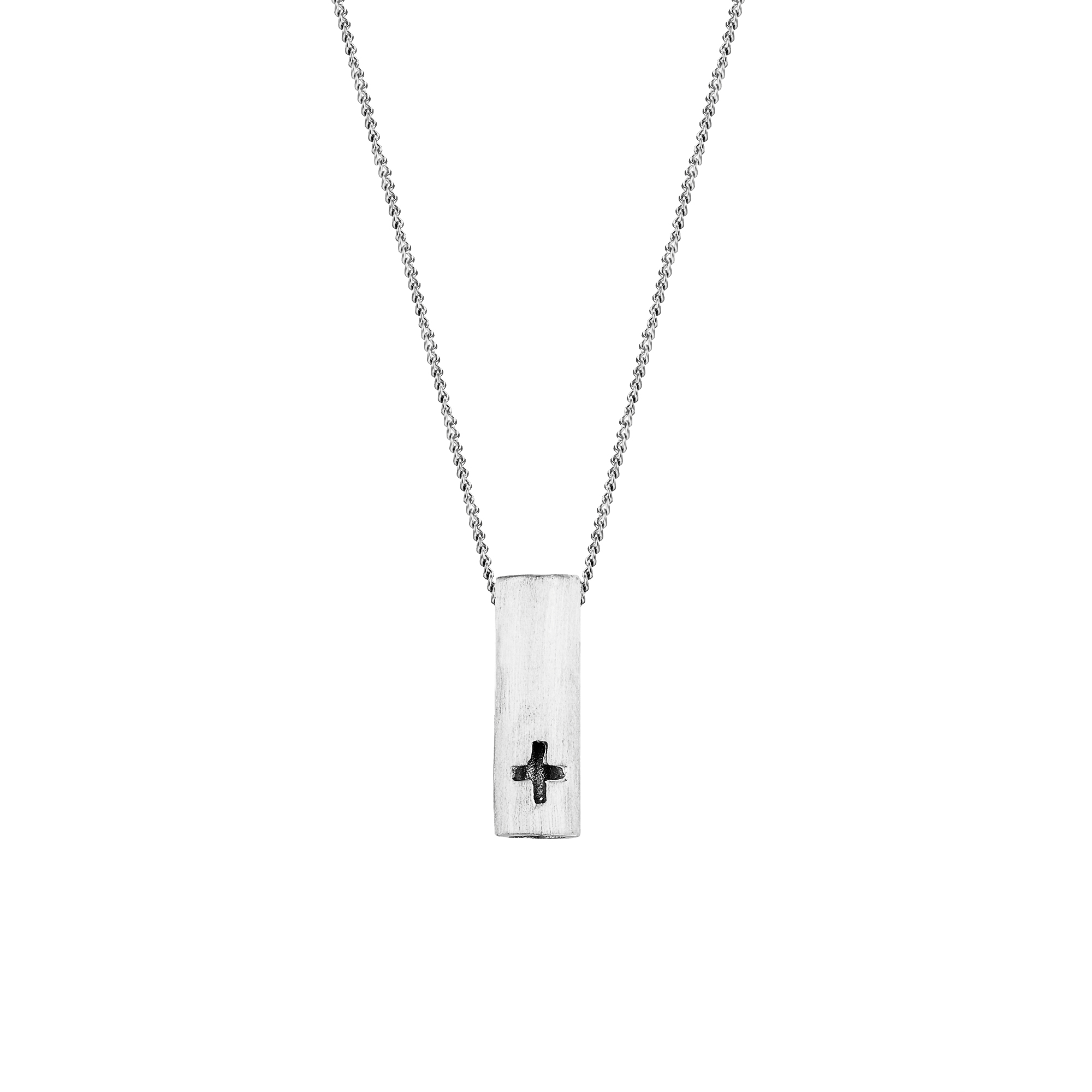 Brushed sterling silver tube pendant with cut out cross. Available in sterling silver (.925), 18ct yellow gold plate over sterling silver (.925) or 18ct rose gold plate over sterling silver (.925).