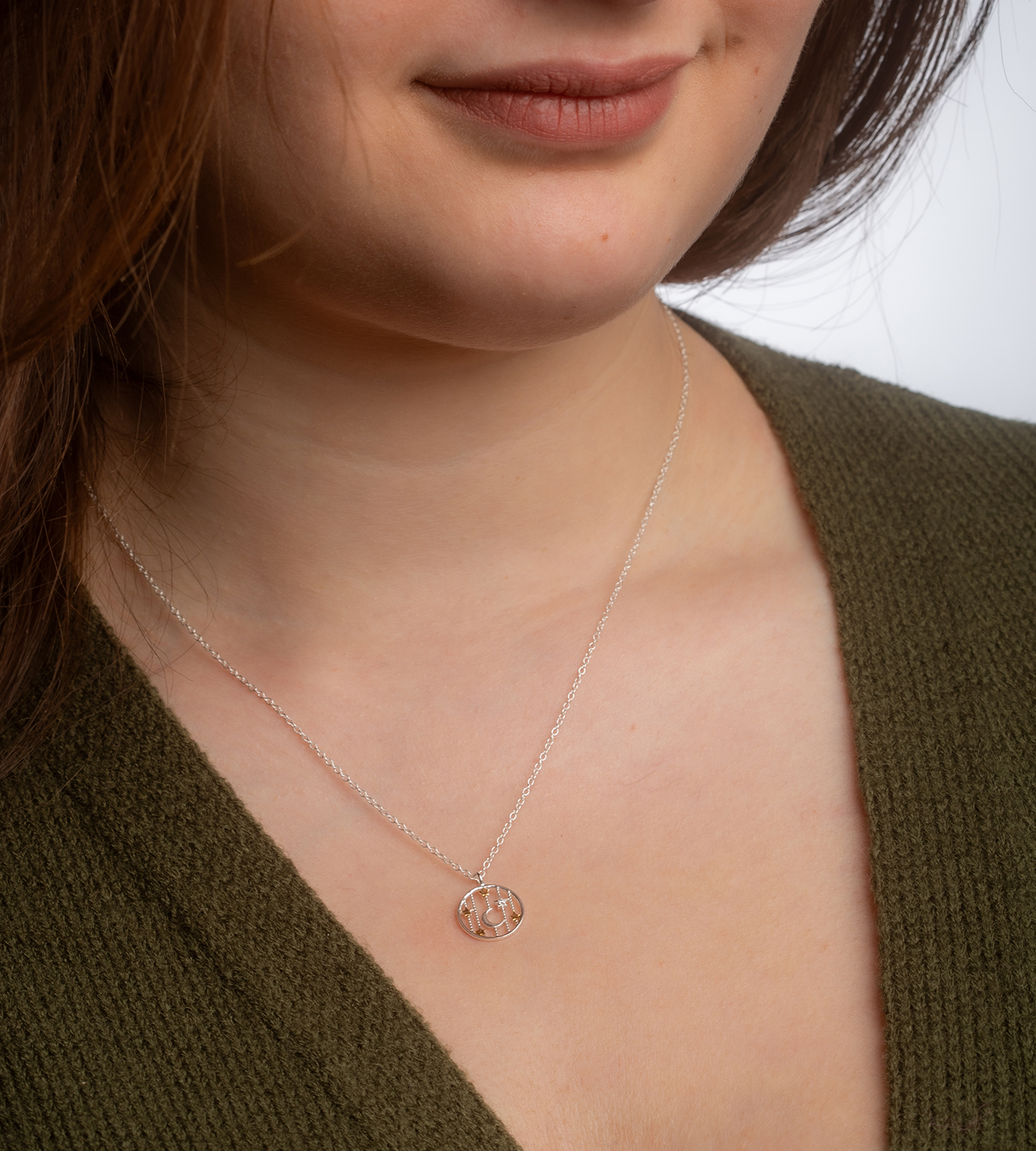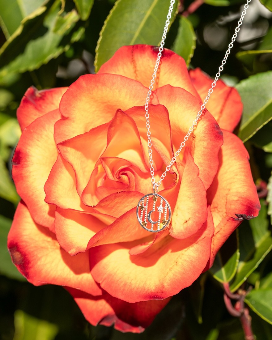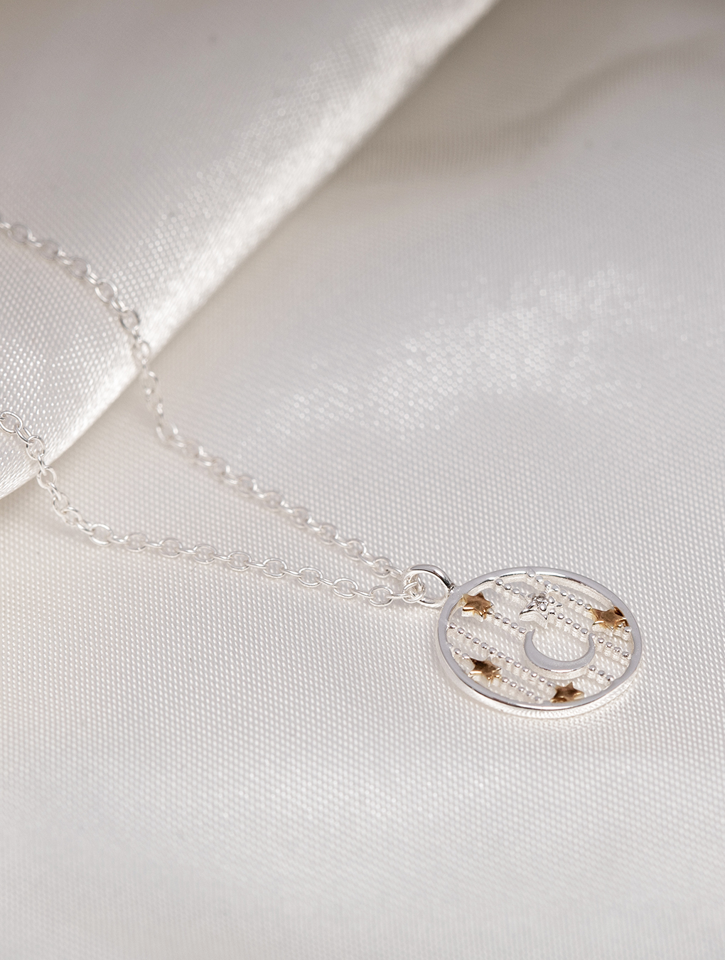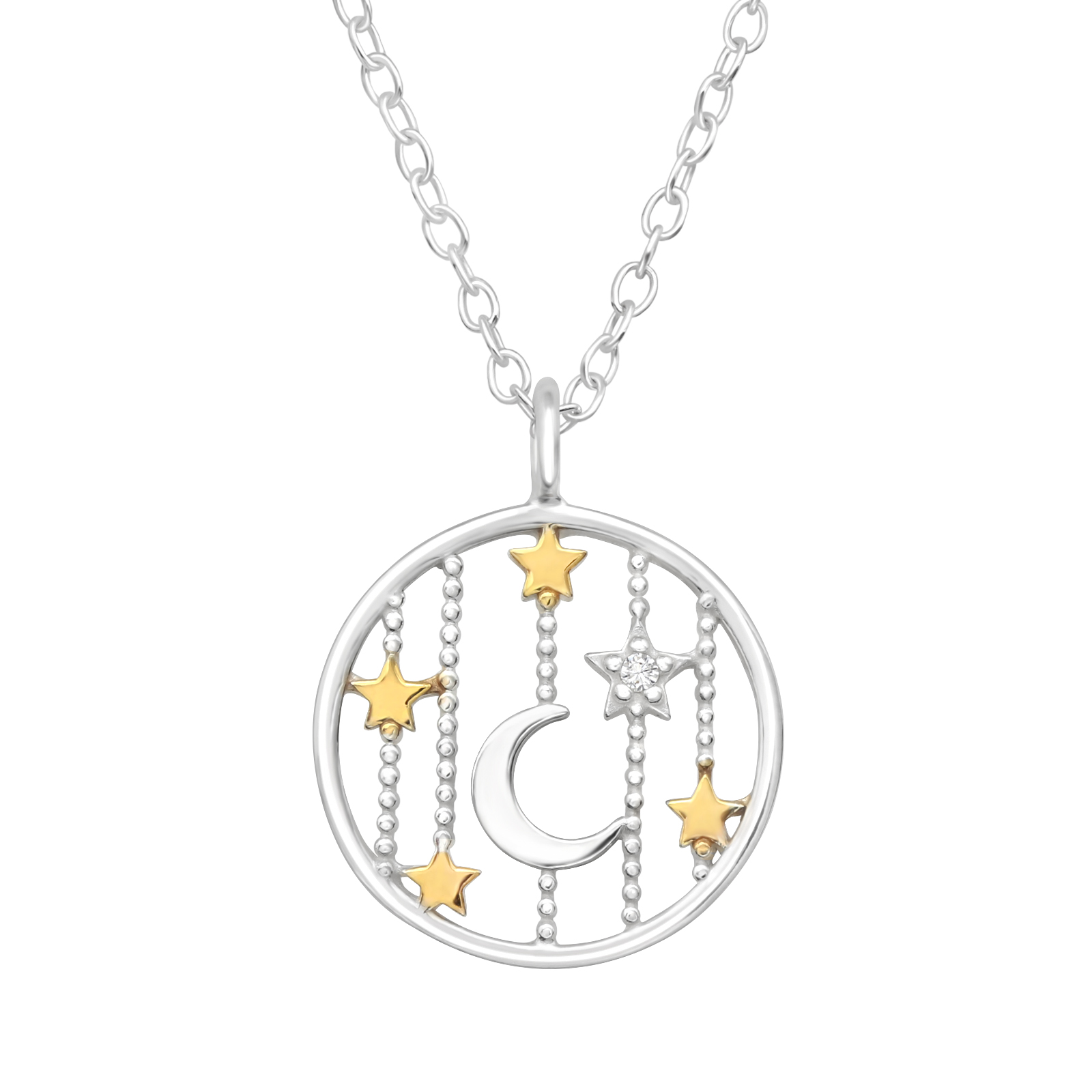 Brighten your jewellery collection with this beautiful two tone silver celestial CZ pendant. The delicate blend of silver and gold tones frames a sparkling CZ stone that catches the light with every move. This versatile, elegant piece adds a perfect touch of shine to any outfit, whether you are dressing up for an evening out or keeping it casual.
