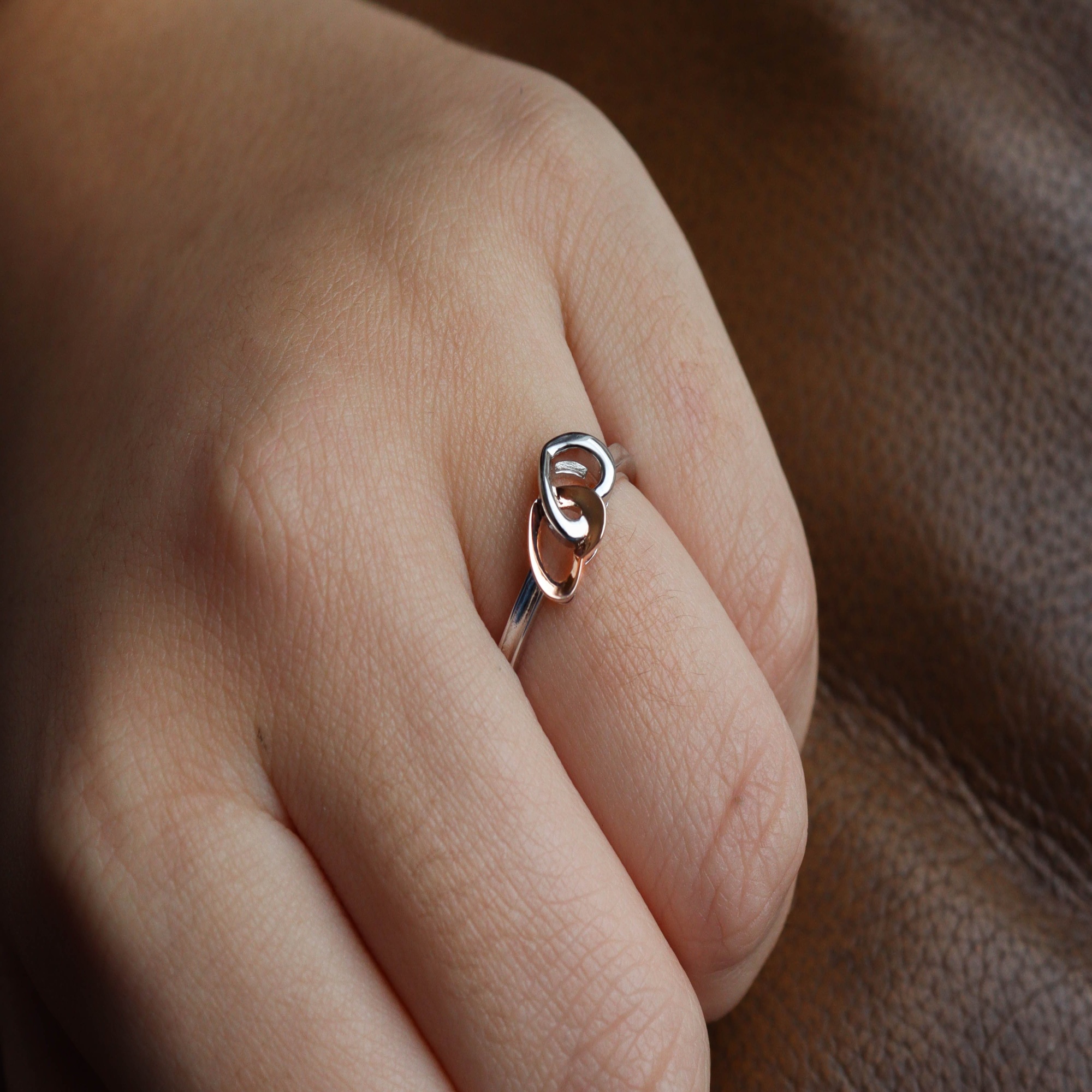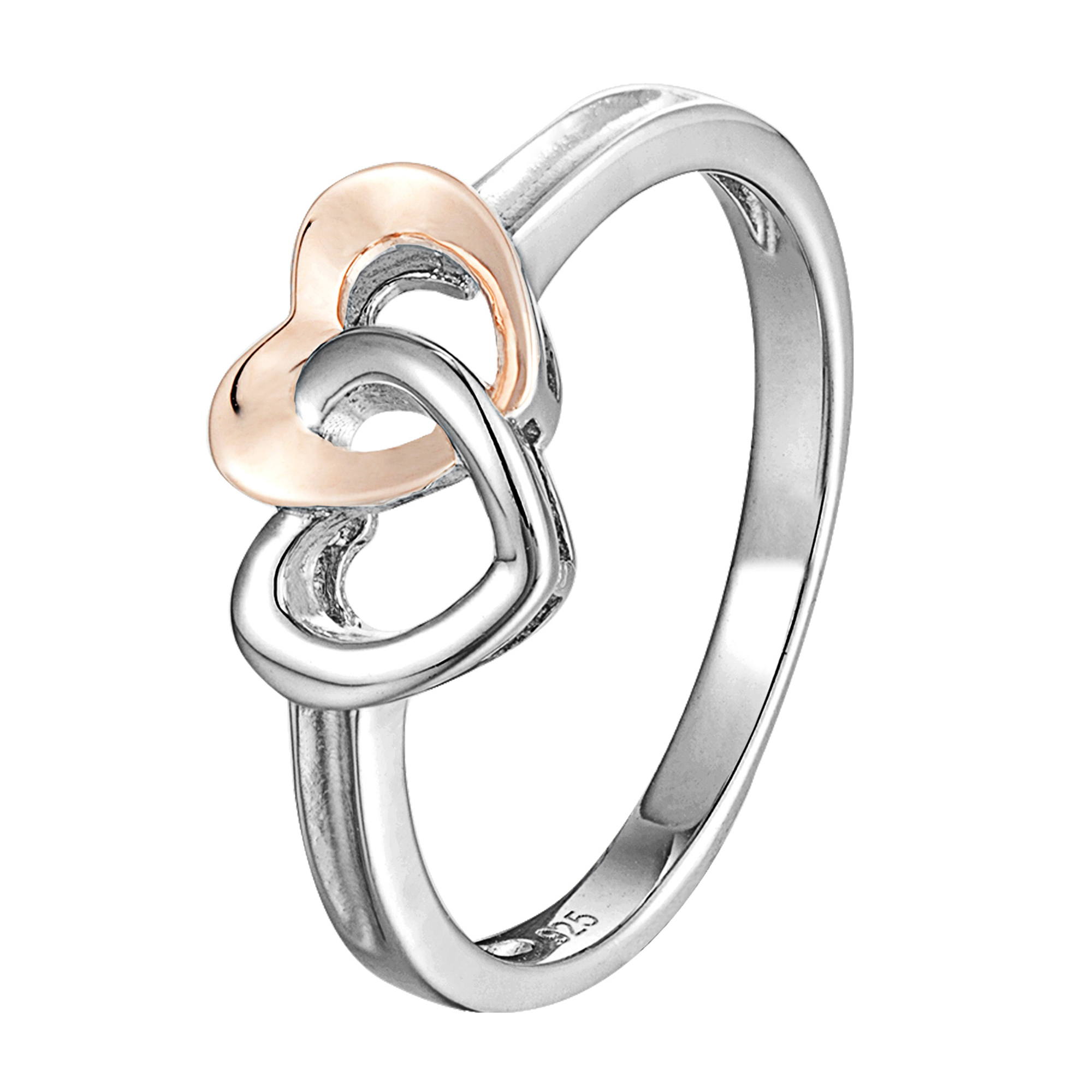 Sterling silver and rose gold plate two-tone linked hearts ring.