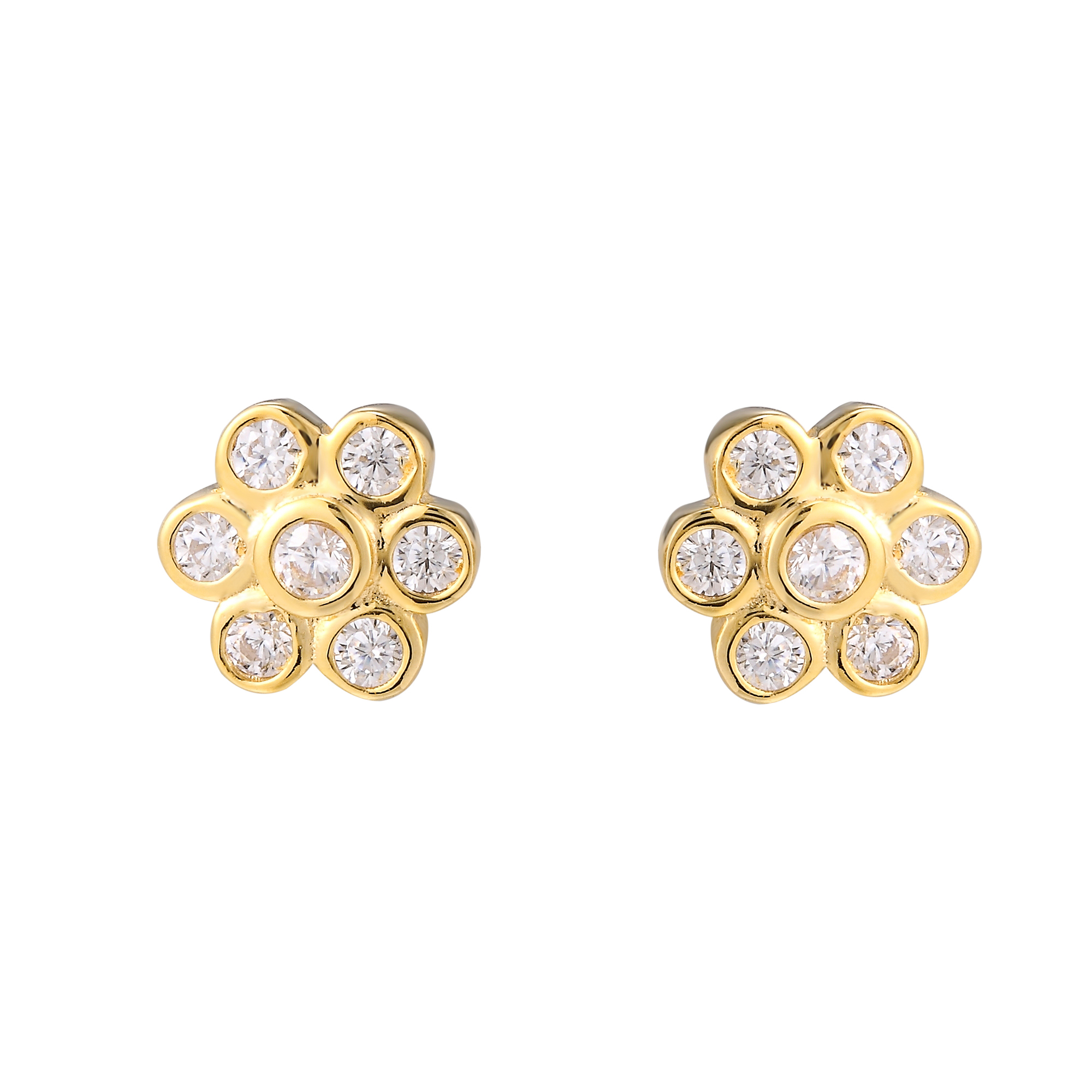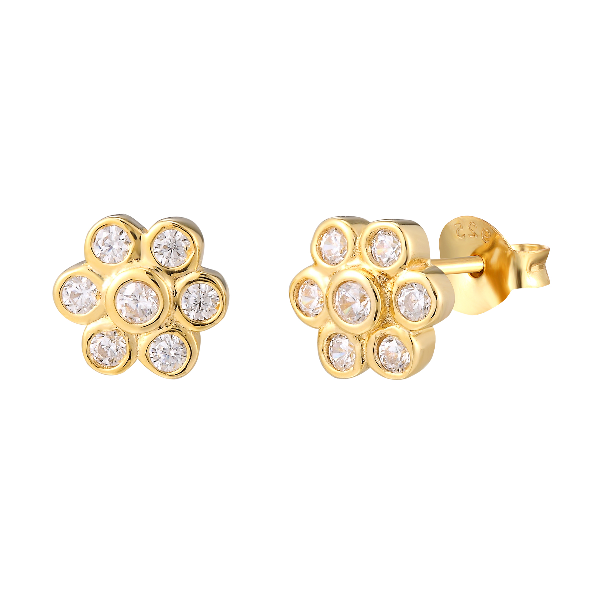 Feminine and luxurious, these pretty cz flower stud earrings make a simple yet chic addition to any outfit. Available in 9ct yellow gold plate over sterling silver, these earrings measure 7mm in diameter and fasten with a butterfly of the same finish. Seven sparkling cz stones are set in a flower setting with a raised centre to give a striking finish. The earrings will arrive in a gift box, ready to give to someone special.