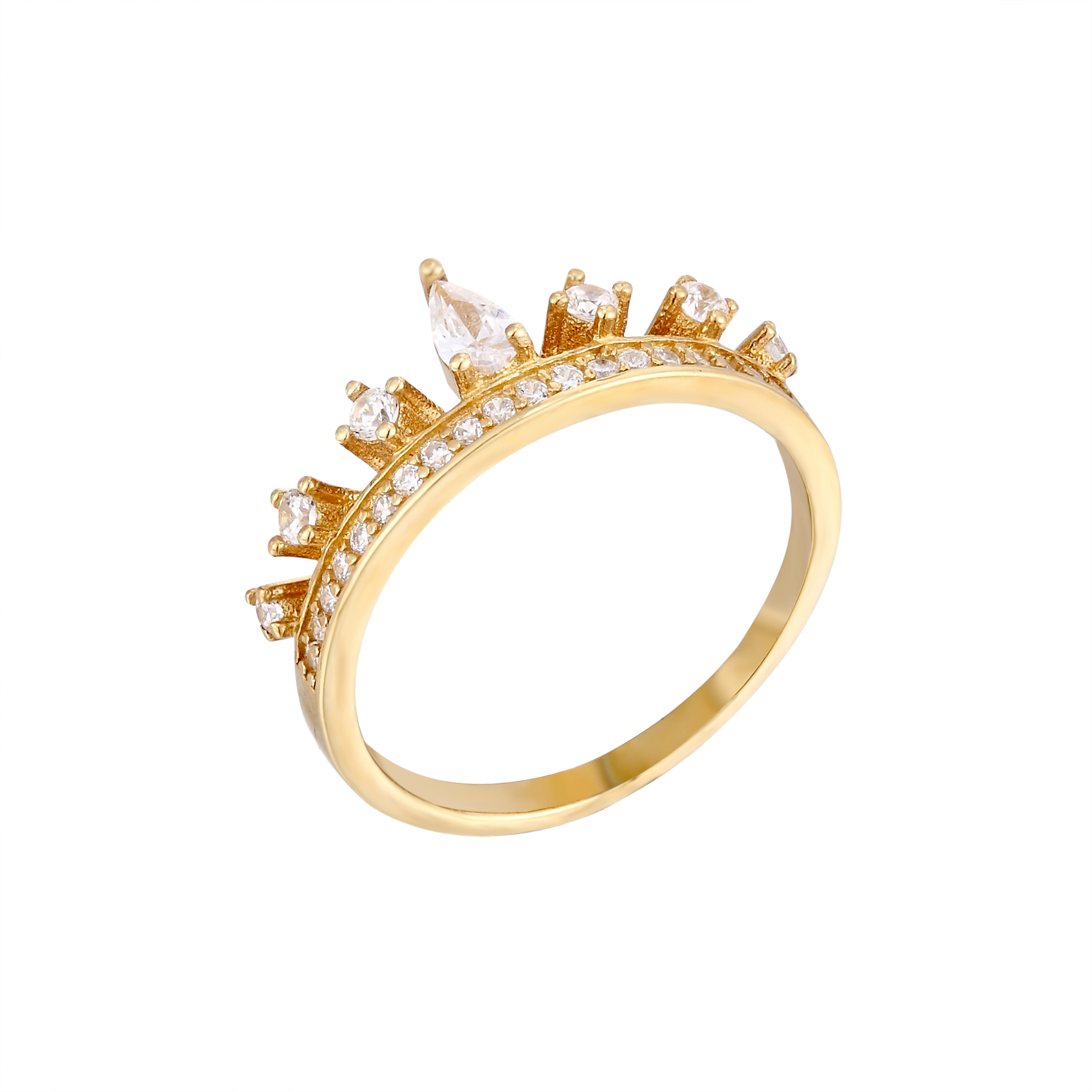 Feminine and fun, this cubic zirconia set crown ring makes a statement addition to any outfit, day or night. The band is pave set with tiny cubic zirconia stones and then with larger raised cz stones in a halo, giving a luxurious finishing touch. Made from sterling silver (925) and then plated in 9ct yellow gold, available in UK ring sizes L, P or T. This will arrive in a gift box, ready to give to someone special.