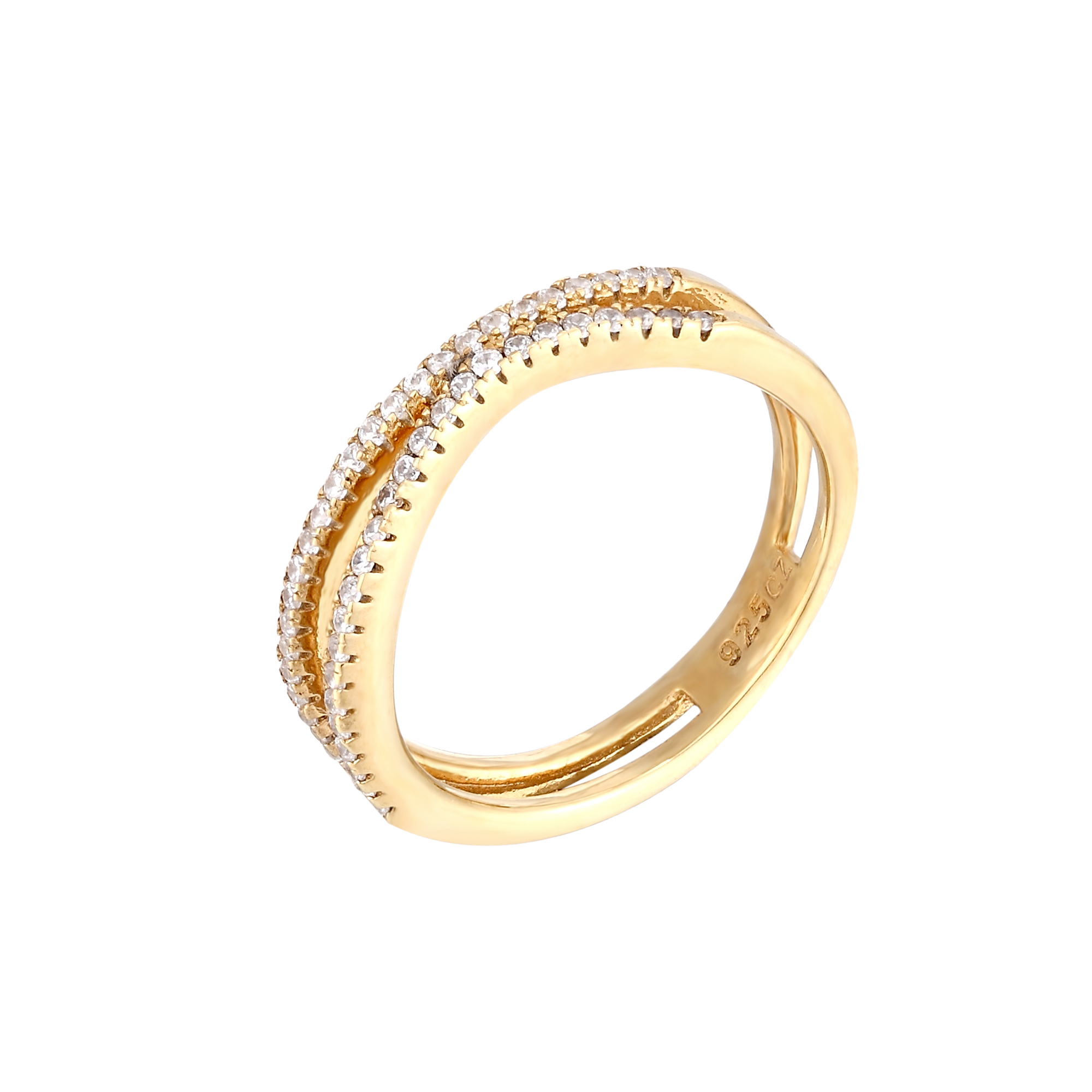 This gorgeous cubic zirconia pave double band stacking skinny ring is lightweight and suitable for everyday wear. Yellow gold plated over sterling silver, the band measures 1mm. Available in UK ring sizes L, P or T. This ring will arrive in a gift box, ready to give to someone special.