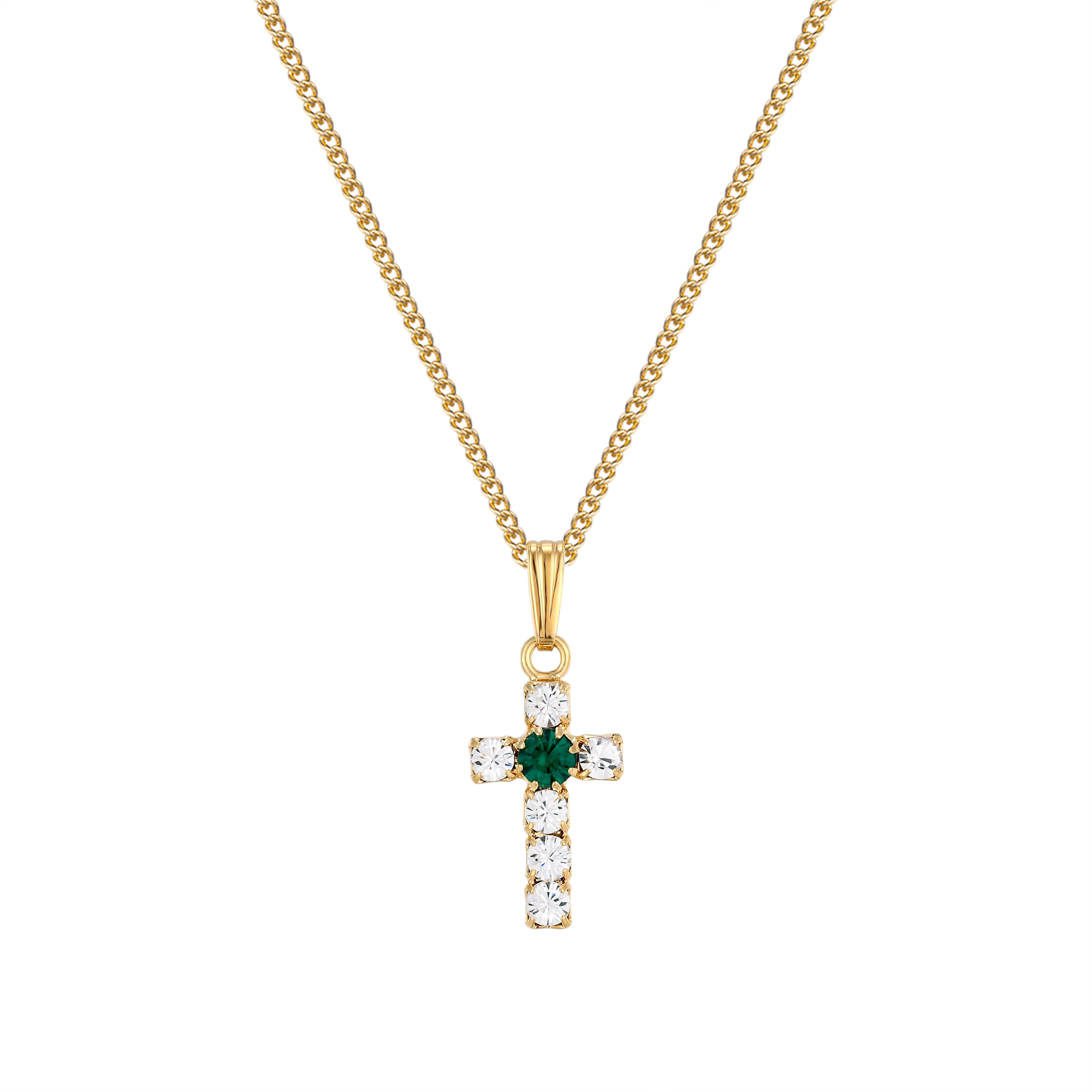 Swarovski crystal cross pendant with an emerald green crystal centre. Available in bright silver plate, 18ct yellow gold plate or 18ct rose gold plate.