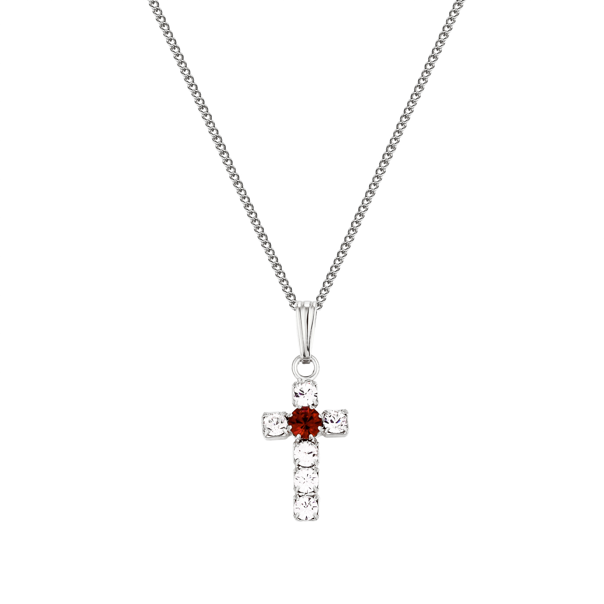 Swarovski crystal cross pendant with ruby red crystal centre. Available in bright silver plate, 18ct yellow gold plate or 18ct rose gold plate.