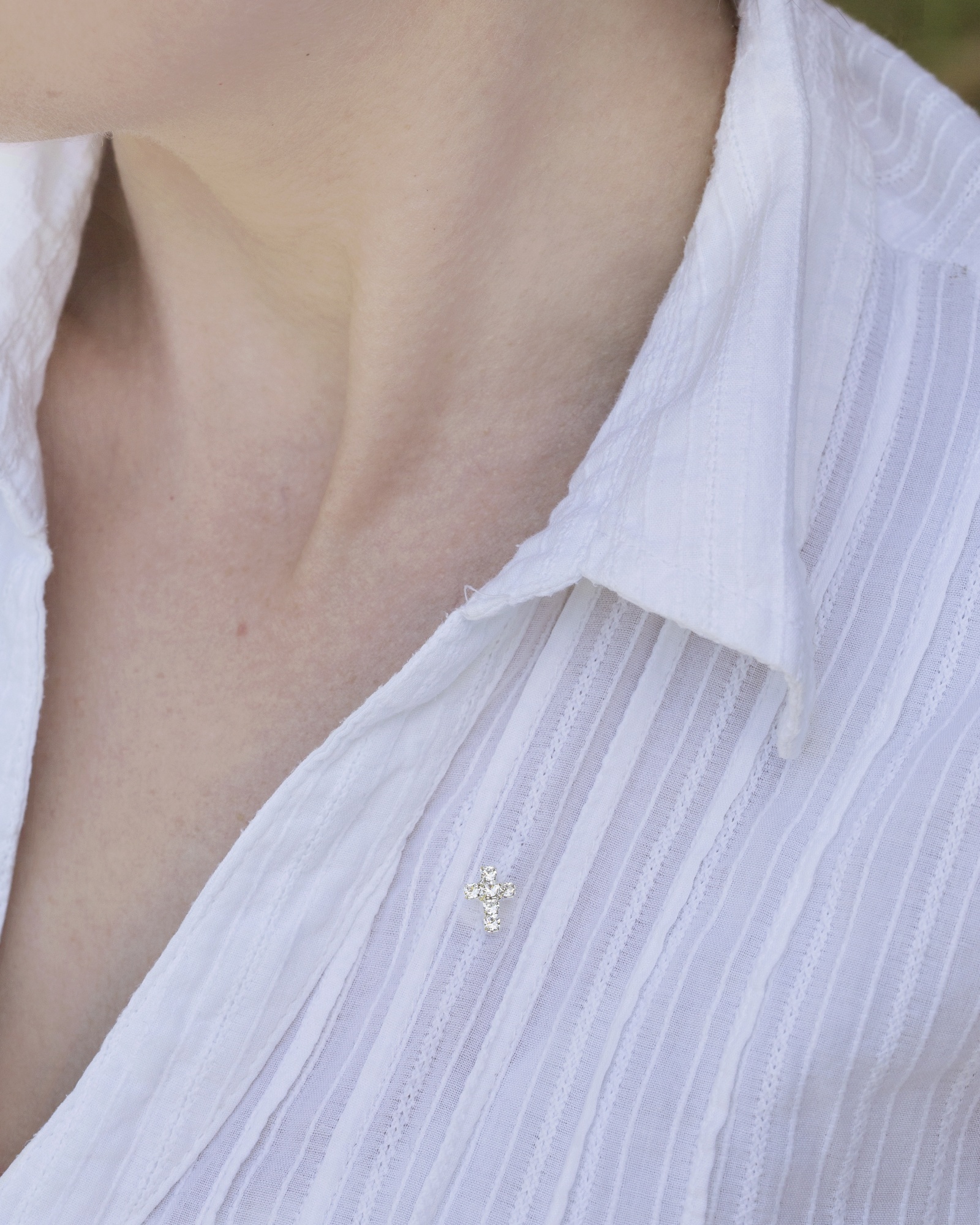 Dainty Swarovski crystal cross pin. Available in bright silver plate, 18ct yellow gold plate or 18ct rose gold plate.