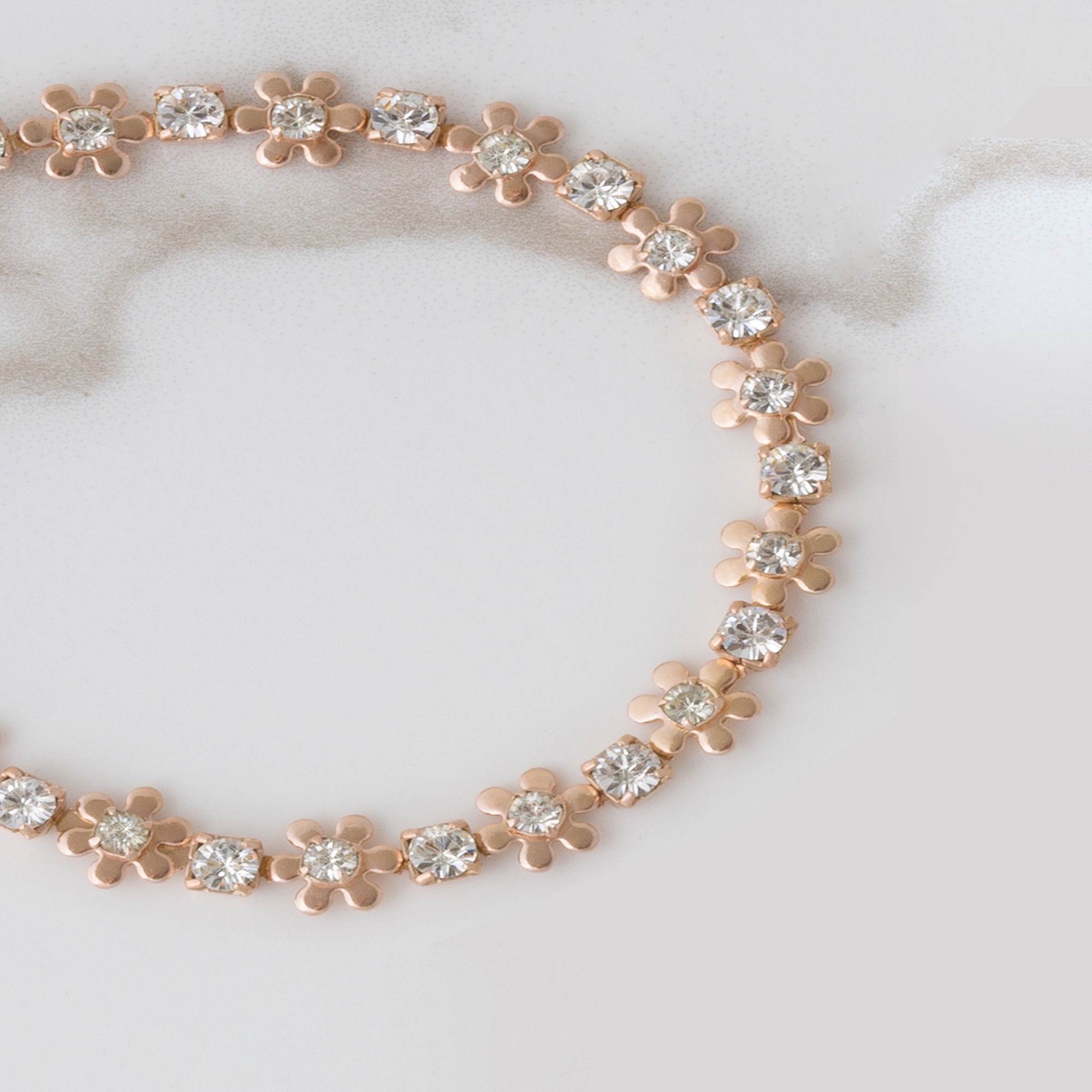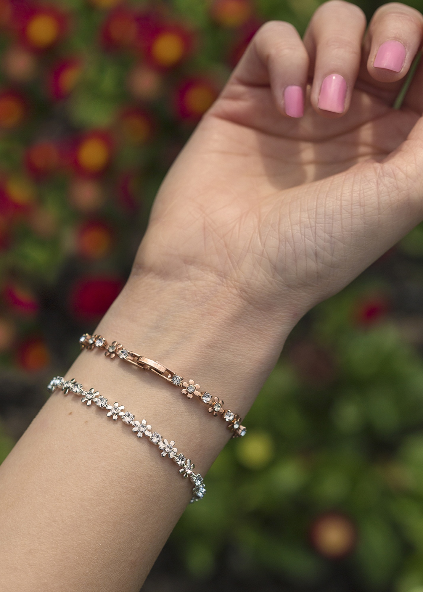 Swarovski crystal flower bracelet with dainty open cross charm. Available in bright silver plate, 18ct yellow gold plate or 18ct rose gold plate.