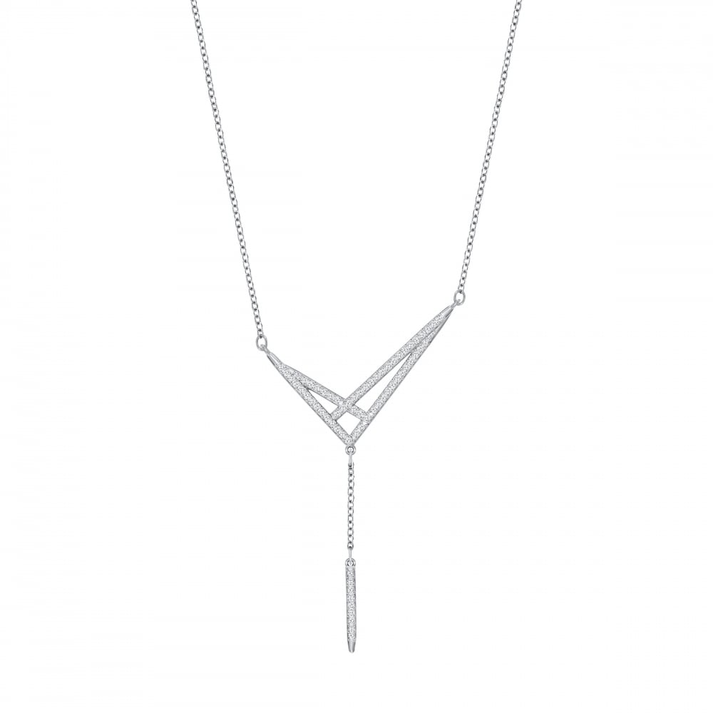 This gorgeous necklace has been crafted from Rhodium plated metal to create a silver effect that shines beautifully in the light. We love the bold geometric pattern from which the pendant hangs, as well as the chains. The pattern and pendant are encrusted with crystal pave that twinkles and shimmers in the light.