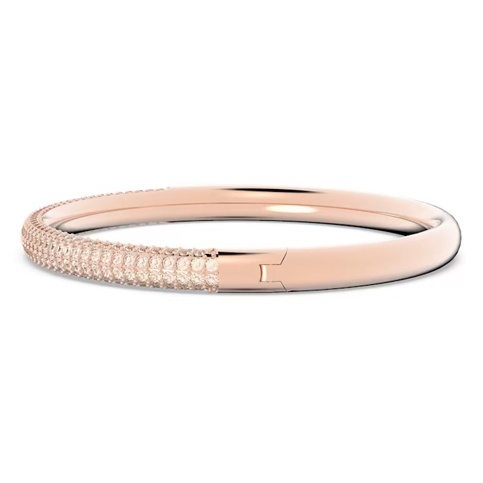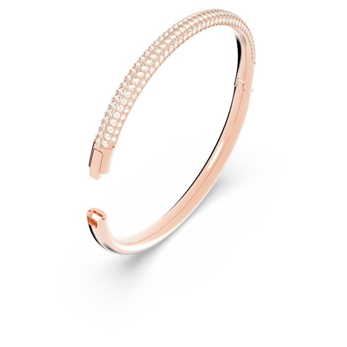 In line with the rose gold trend, this stainless steel bangle impresses with four rows of sparkling Silk crystal pave on the front side. Wear it alone or stack it together with other bangles for a glamorous look. The fully integrated closure ensures a smooth finish.