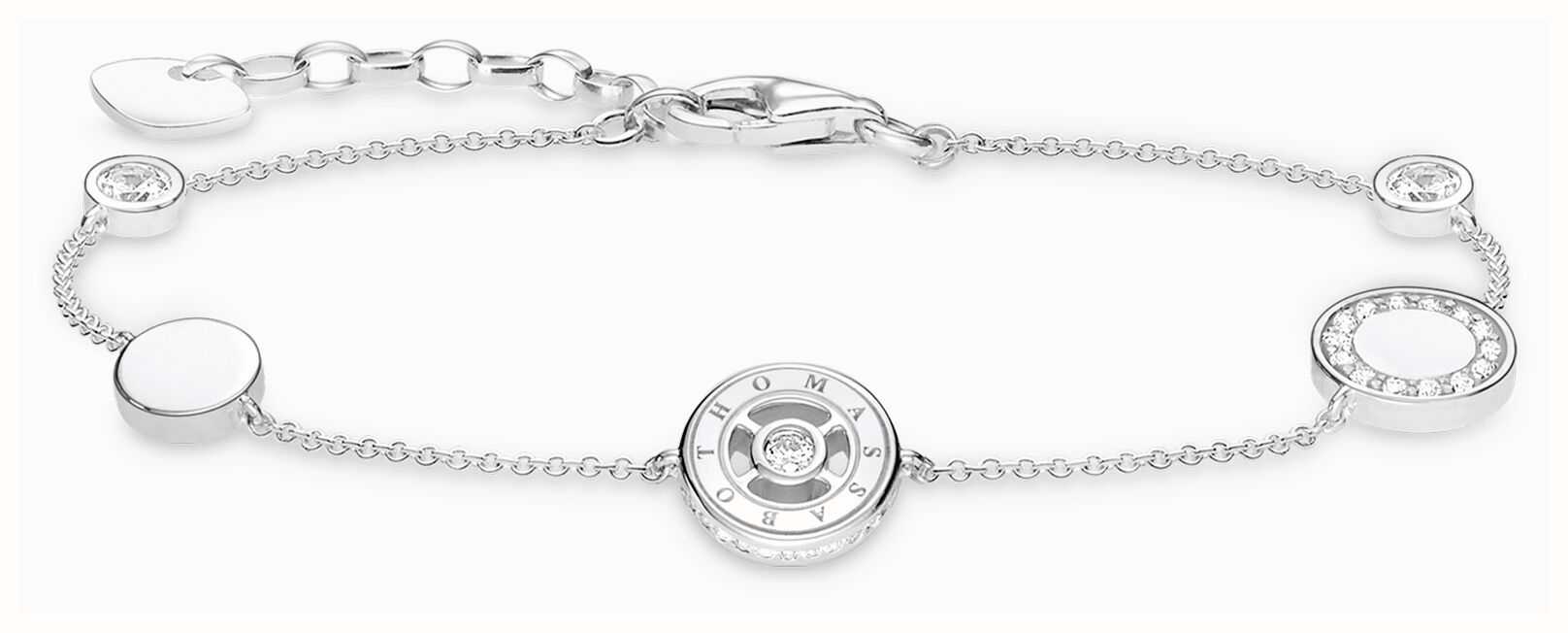 A circular charm is positioned at the centre of the bracelet. It is set with a white crystal. Two more silver disc-shaped charms are on either side of this. These charms are framed by bezel-set white crystals.