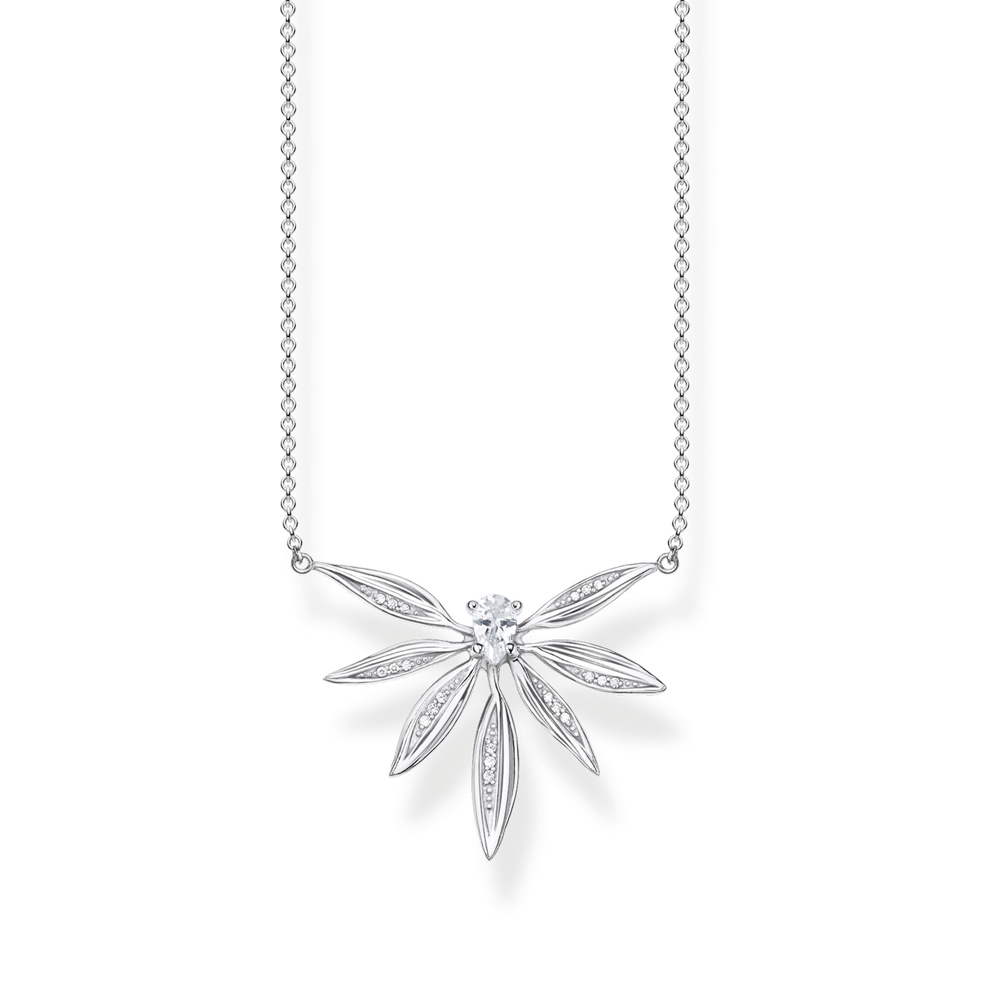 Feel extra glamorous: Fine lines and elegant shapes characterize this beautiful silver necklace for women with a small leaf pendant. The drop-shaped white zirconia in the centre and the small hand-set stones on the leaves draw all the attention in towards the piece of jewellery. Style it to your favourite neckline easily by adjusting the length of the silver chain for women to your decollete.