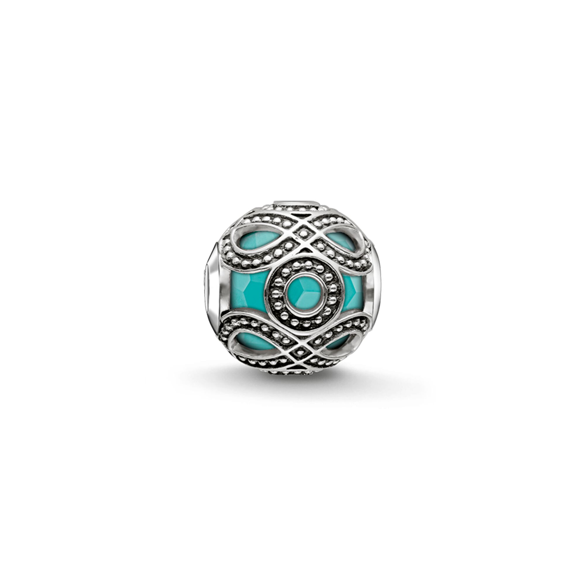 With the turquoise-coloured, culturally inspired Bead, a web of blackened 925 Sterling silver subtly encompasses a core of imitation facetted turquoise that is said to provide self-confidence and energy.