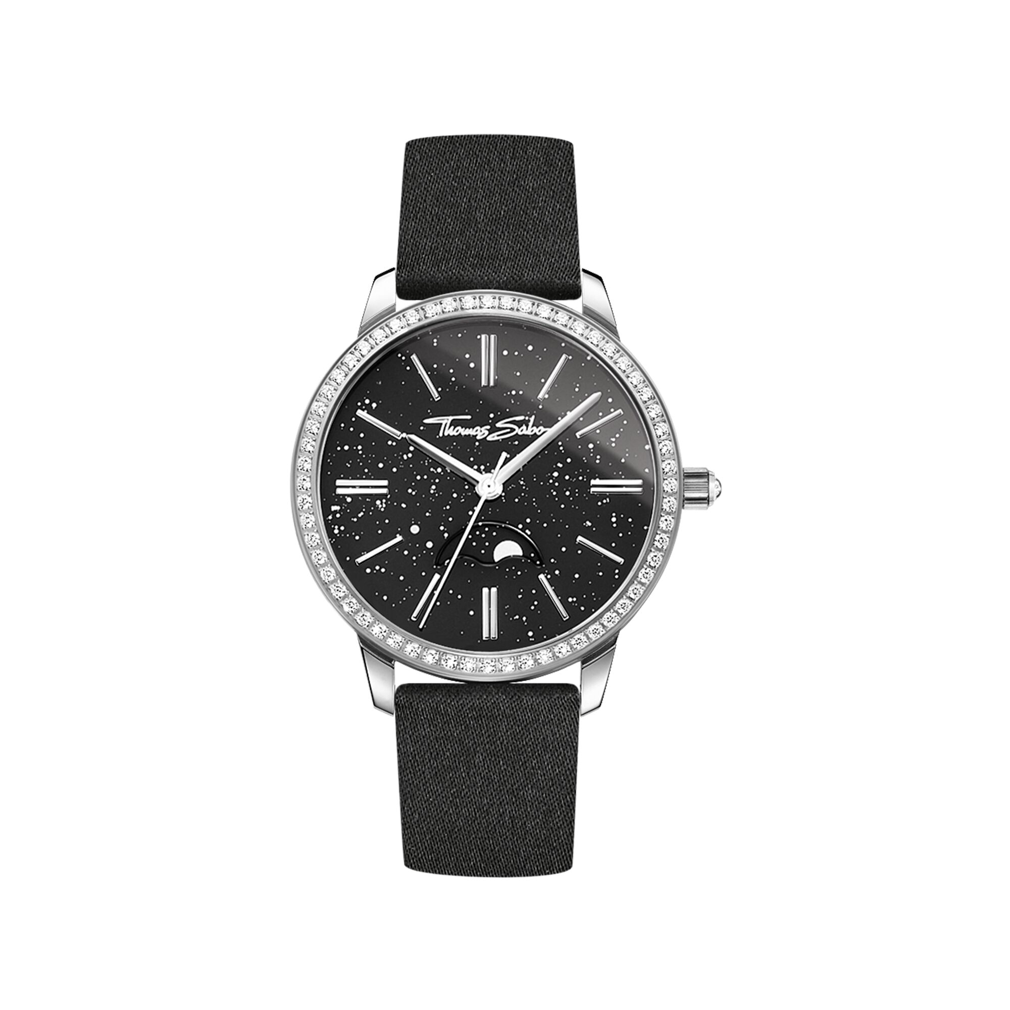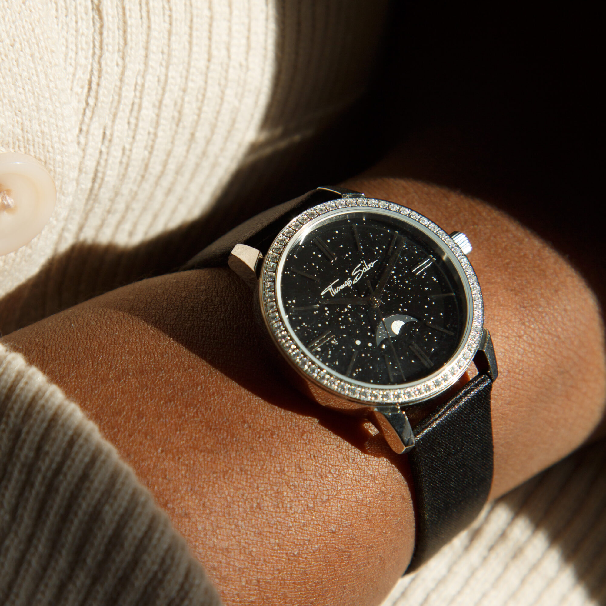 One of the most renowned complications finds its way into one of the most elegant quartz watches by Thomas Sabo, the moonphase display at 6 o’clock. Captured in a feminine timepiece, the night sky becomes a model of style and gives the Spirit Moonphase Movement 1984 watch a poetic touch. The dial depicts the starry night sky of May 8, 1984 as a tribute to the birth of Thomas Sabo. Technically refined and classic in design, the stainless steel women’s watch captivates with its glamorous look with zirconia-adorned bezel and classic satin band.