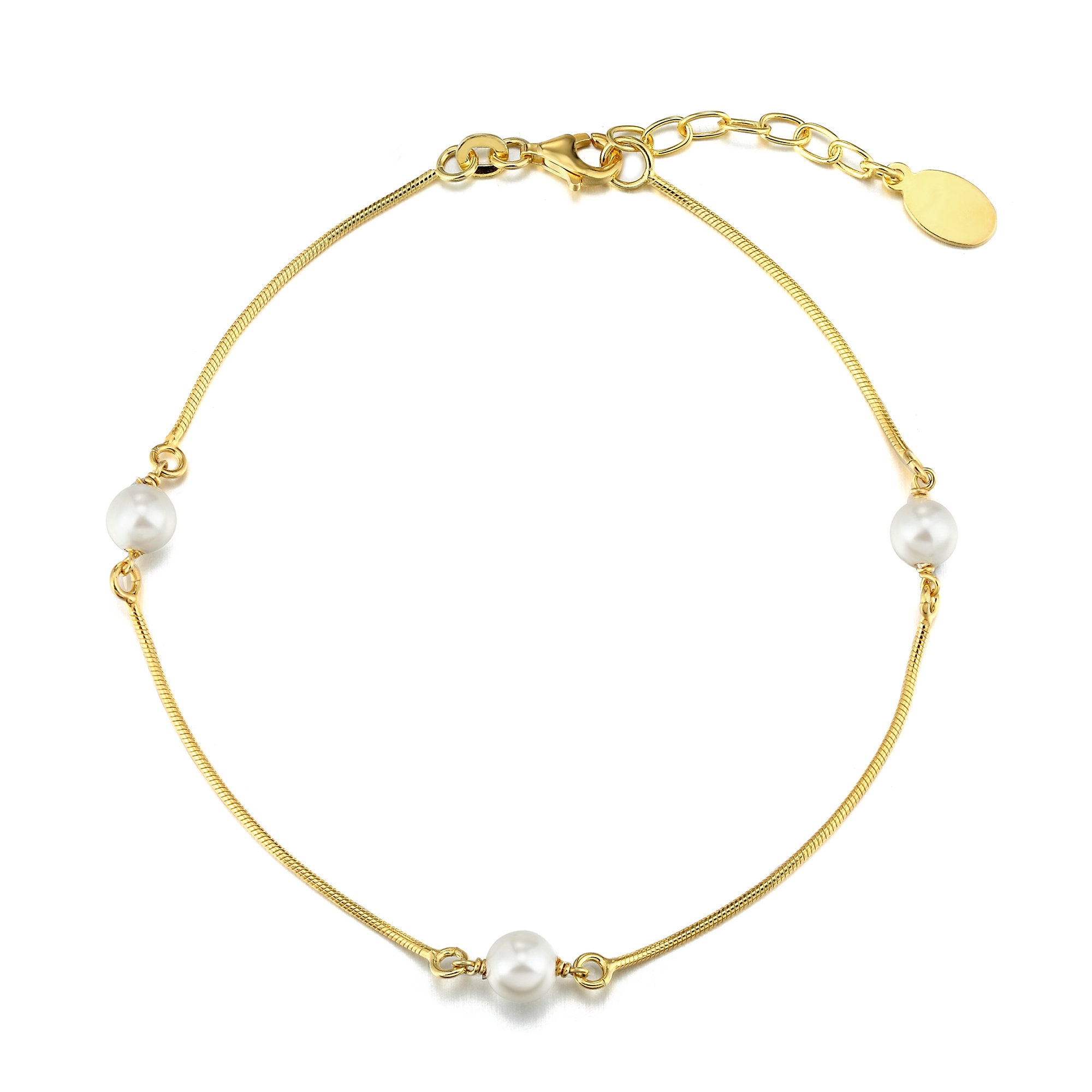 An anklet that features 3 pearls placed evenly around the product. Feminine, dainty and easy to wear. Made from sterling silver. Available in 18ct gold plated sterling silver, 18ct rose gold plated sterling silver or sterling silver. Chain measures: 8inches +1inch extender