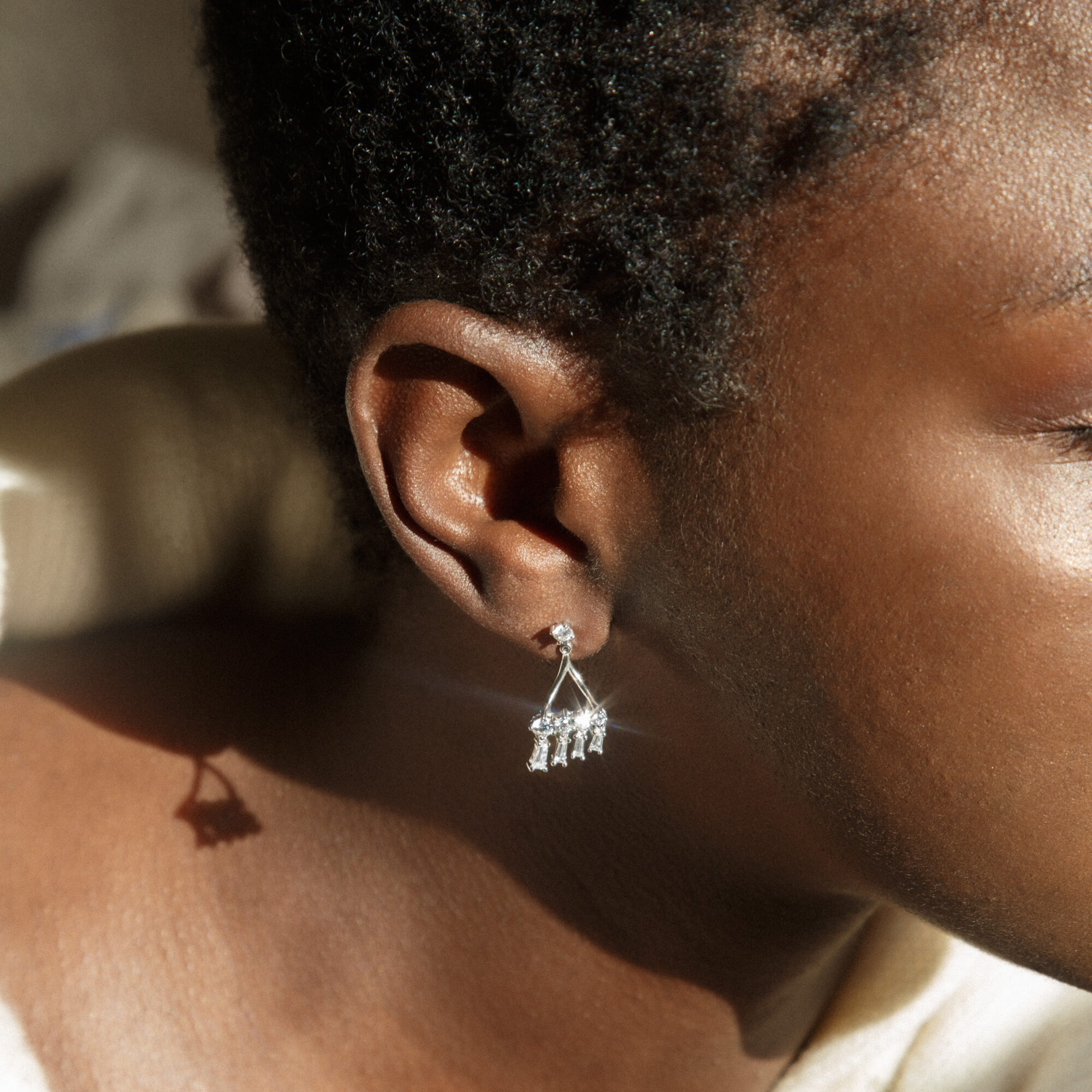 Make a stunning statement with these chandelier jacket earrings. With sparkling crystals that sit from behind the ear and dangle below the lobe for a stunning and modern twist on the statement earring. Made from sterling silver.