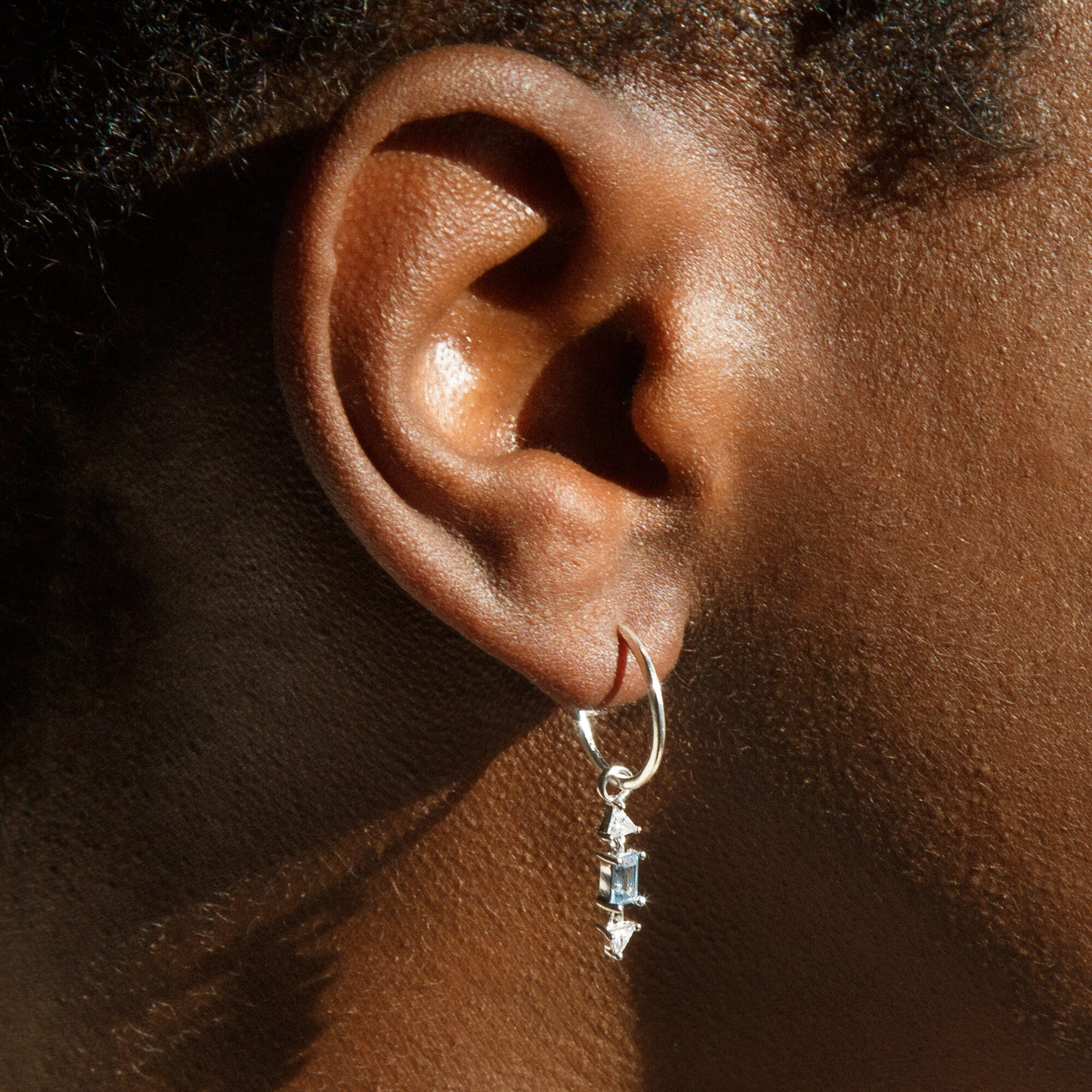 Customise your look with this ear pendant which hooks onto any creole hoop for a cute charm. Sparkling with white and aquamarine crystals, this is the perfect way to update your look.