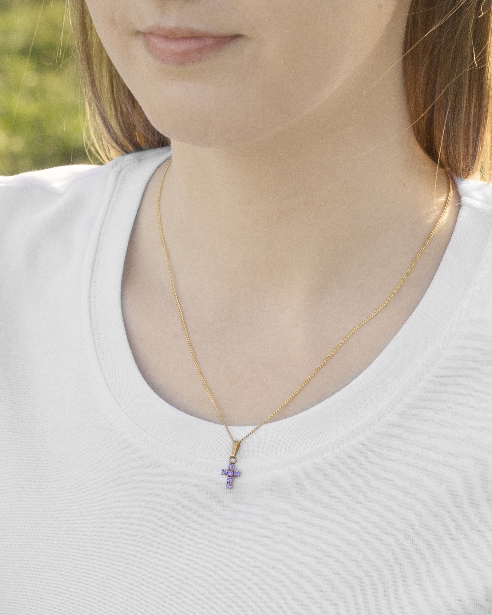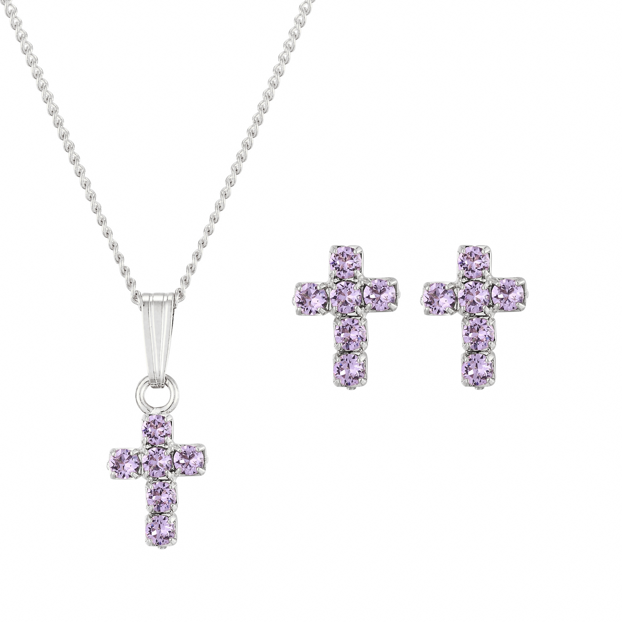 Violet Swarovski crystal cross earring and pendant set. Available in bright silver plate, 18ct yellow gold plate or 18ct rose gold plate.