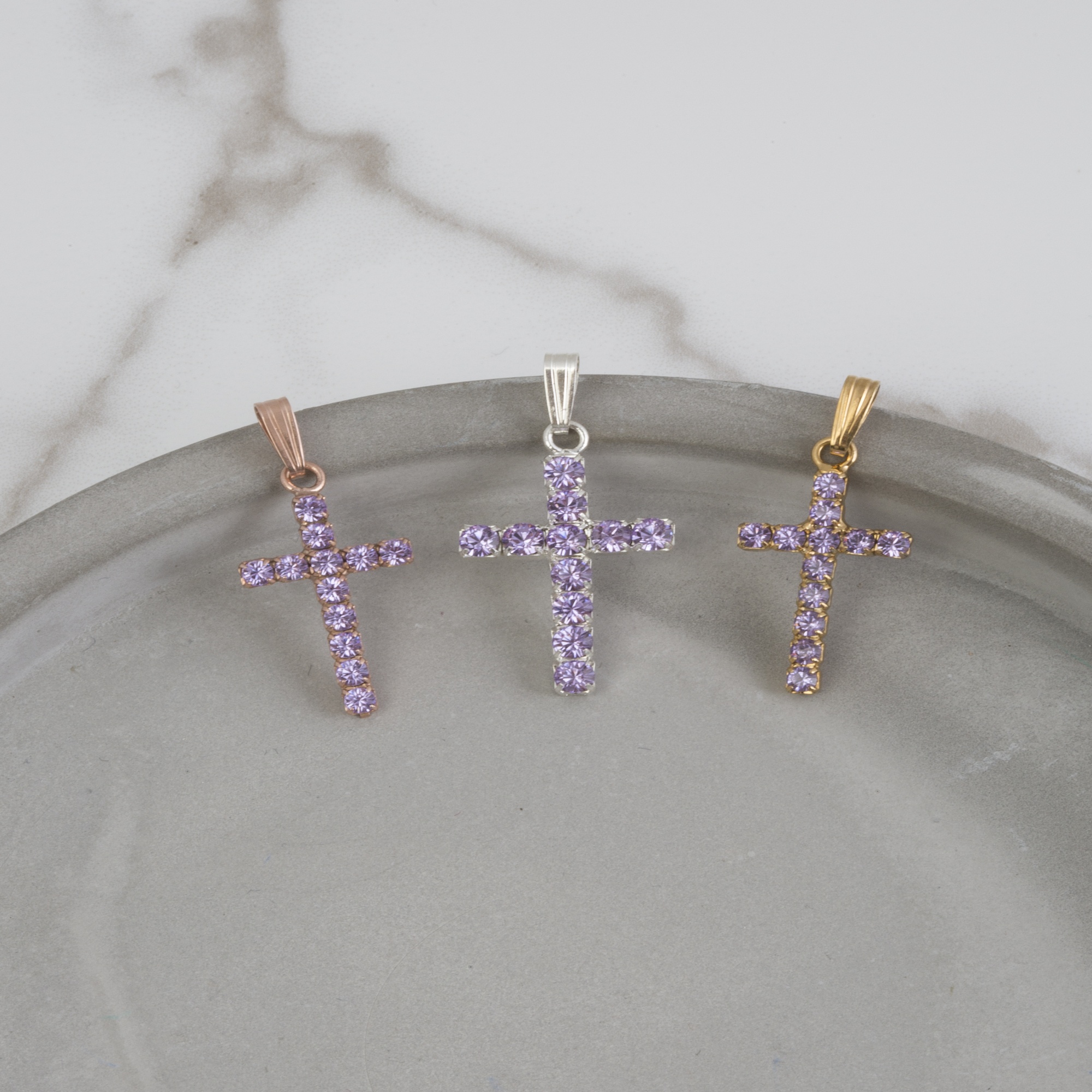Violet Swarovski crystal cross pendant. Available in bright silver plate, 18ct yellow gold plate or 18ct rose gold plate.