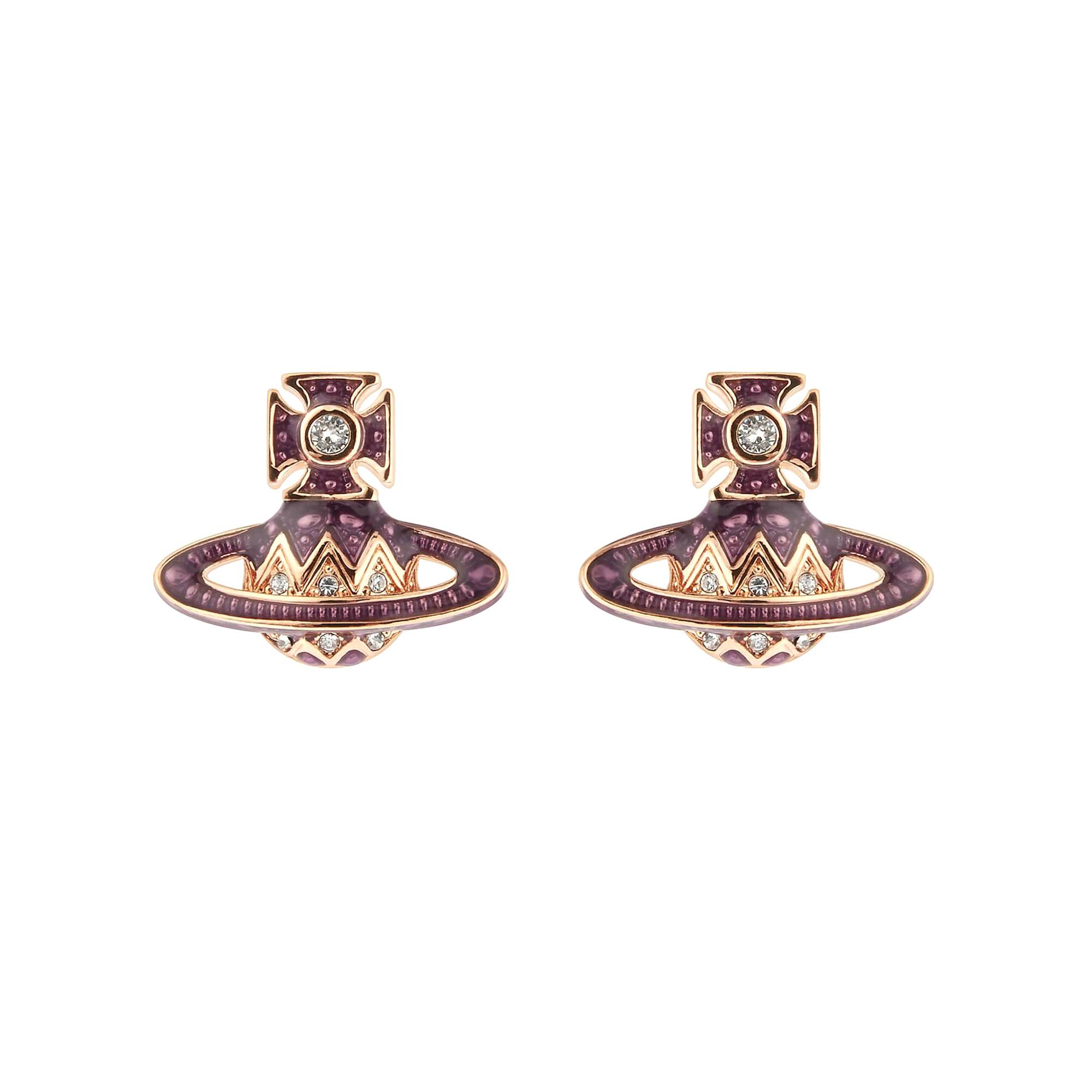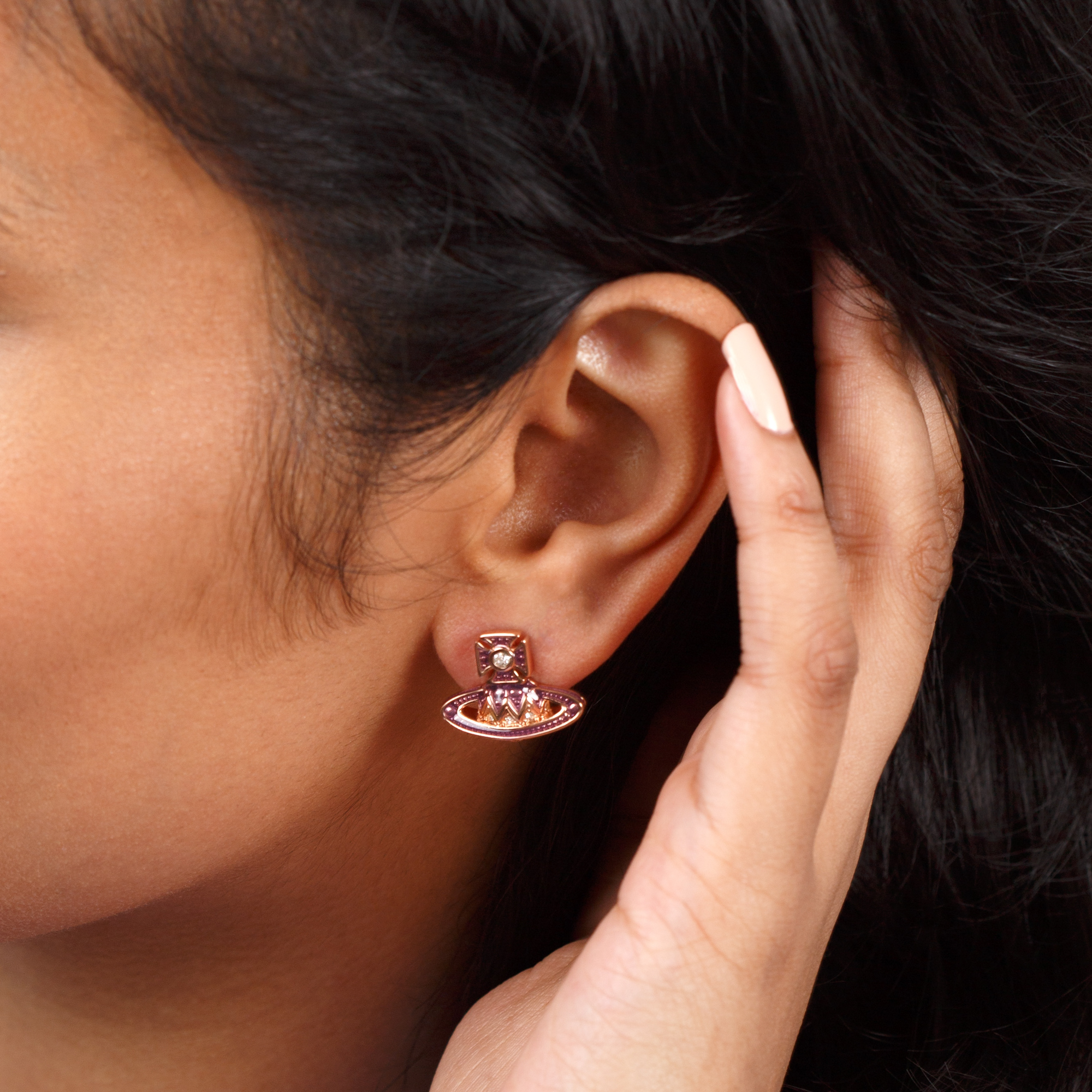 These Vivienne Westwood earrings combine vibrancy with elegance in the true ethos and style of the British brand. Crafted in rose gold-tone brass, the ‘Aretha’ earrings resemble the iconic Vivienne Westwood orb logo for that instantly recognisable look. Featuring dual-tone enamel plating in contrasting peach and purple tones, these earrings are completed by a selection of crystal stud detailing on the fronts. Beneath the surface, a delicate pattern of metal gemstones can be seen, giving this accessory a multi-faceted sheen. The ‘Aretha’ earrings come with butterfly backs for a secure fastening.