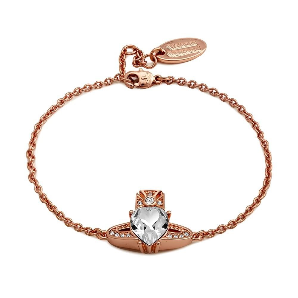 A design inspired by the beauty of love, the Vivienne Westwood Ariella Bracelet is an elegant piece with a heart-shaped crystal at its centre. Perfect for adding a romantic glamour to any look, the bracelet is adjustable from 15cm to 17cm. Metal: Brass. Presented in official Vivienne Westwood packaging. Available in roe, gold, or silver finish.