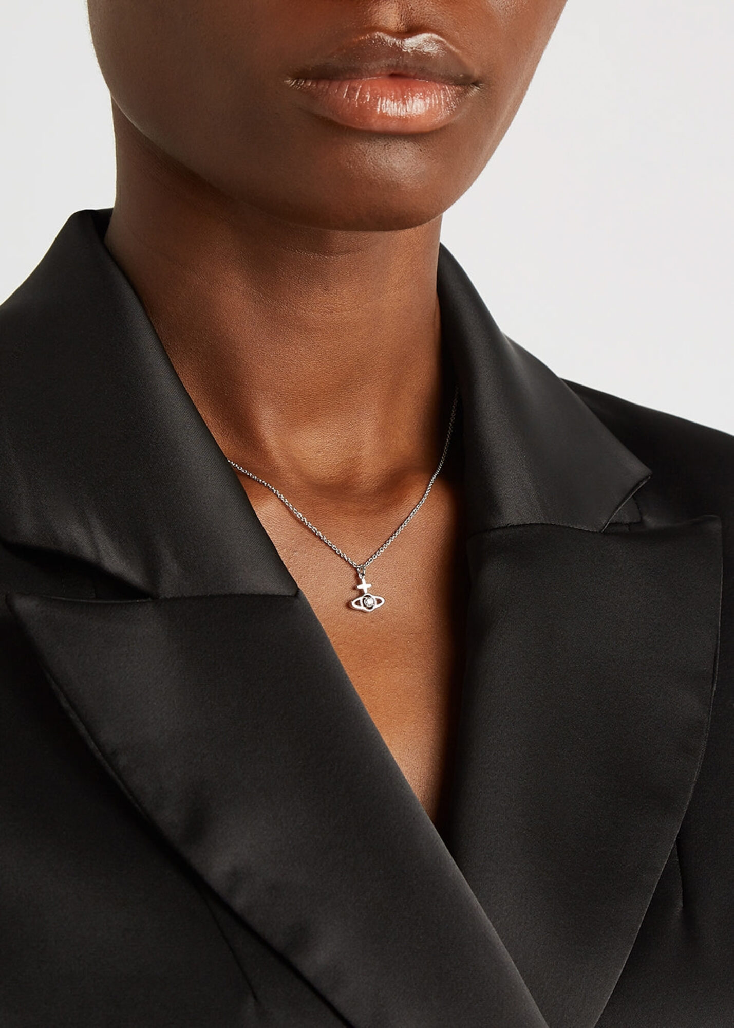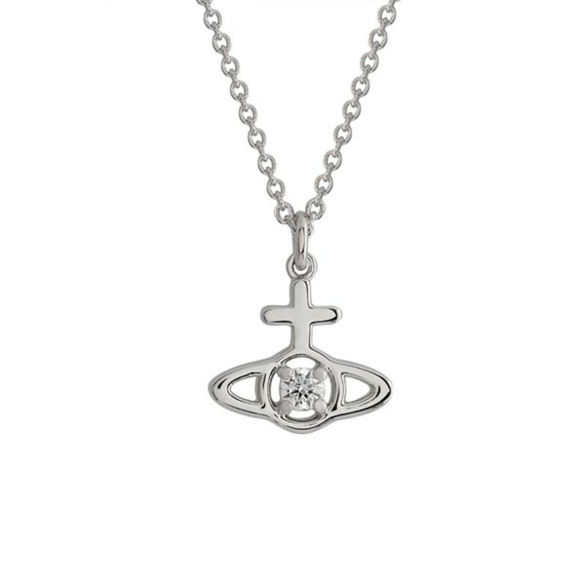 The elegant Lalita Necklace features a sparkling orb set with cubic zirconia. The setting of the zirconia has a hole at the back which allows the light to shine through. Metal: Brass with Rhodium plating. Presented in official Vivienne Westwood packaging.