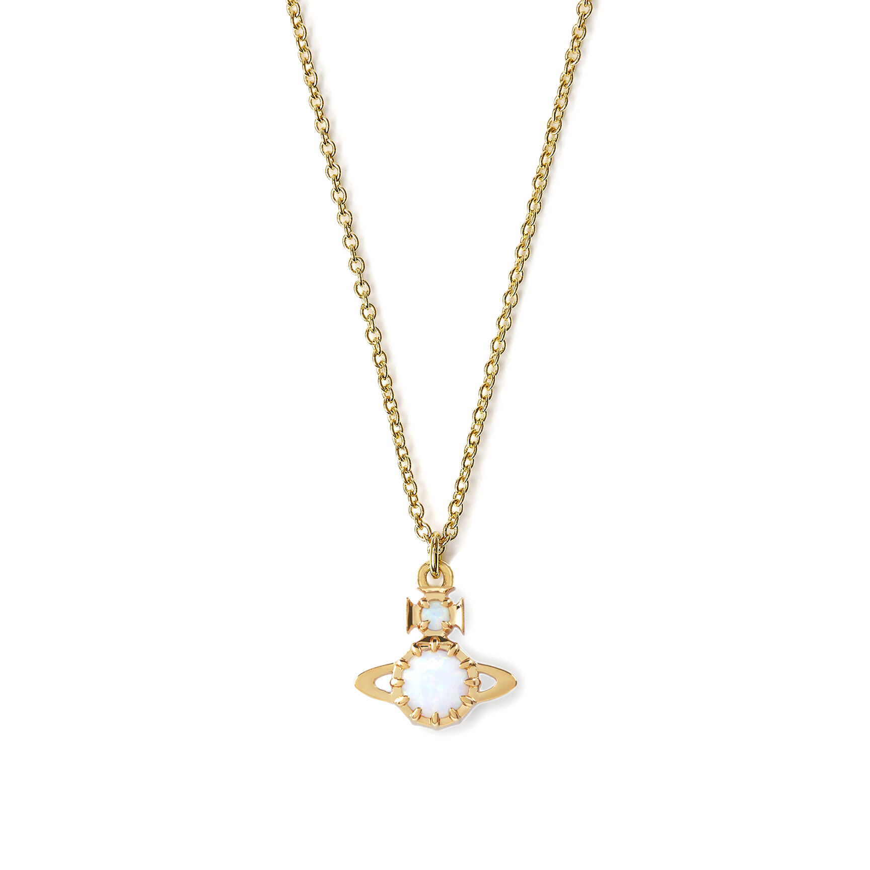 This eye-catching necklace from Vivienne Westwood is embellished with a synthetic opal pendant in the orb design. Available in rose or gold-tone finish.