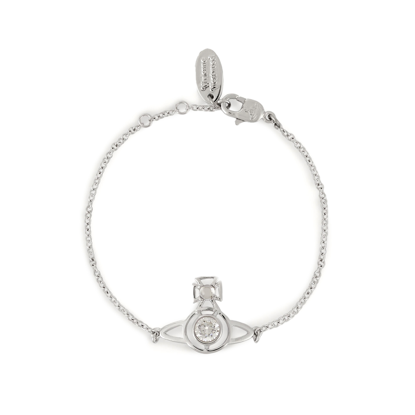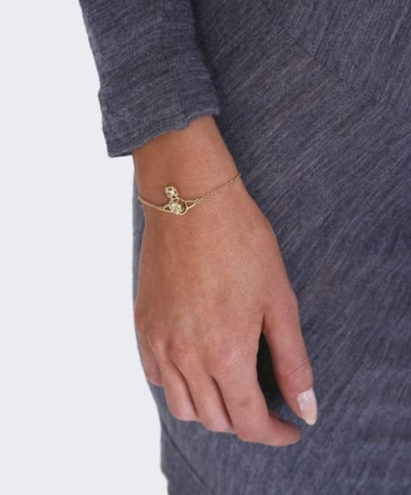 The Nora Bracelet features the iconic Vivienne Westwood Orb centred with a sparkling cubic zirconia crystal, beautifully appearing to be suspended in the air. Metal: Brass. Chain Length: 17-19cm, Orb Dimensions: H 1.6cm x W 2.4cm. Presented in official Vivienne Westwood packaging.