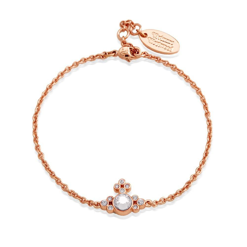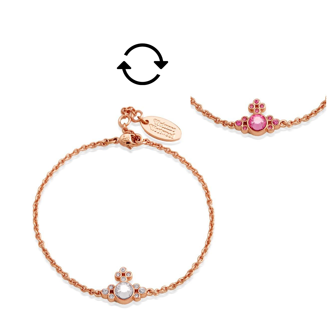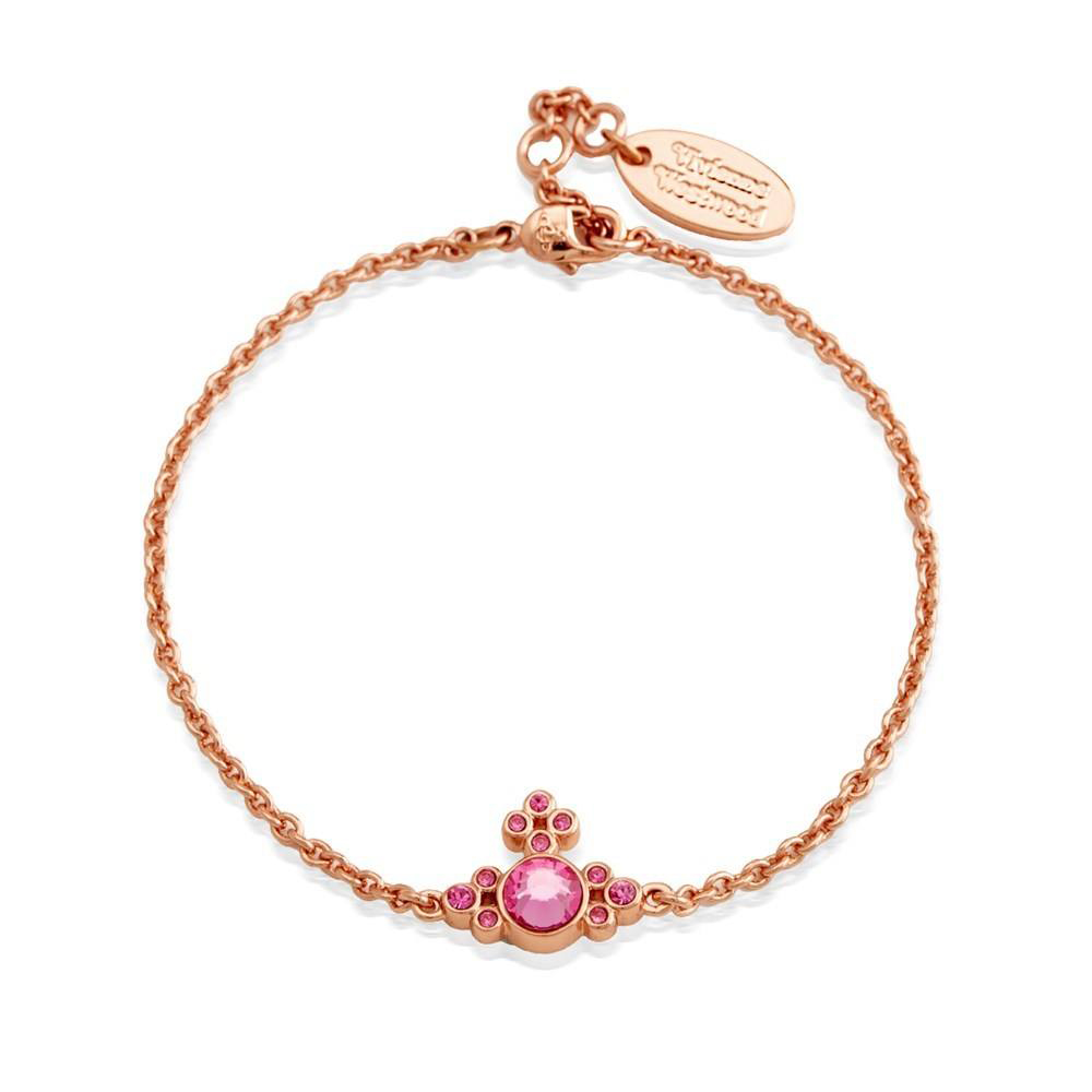 Pop this daring bracelet on to add some energy to your look. Crafted in a rose gold plating, this fine chain bracelet features a sparkling version of the Vivienne Westwood orb logo, made with bright pink crystals. Matching items are also available.