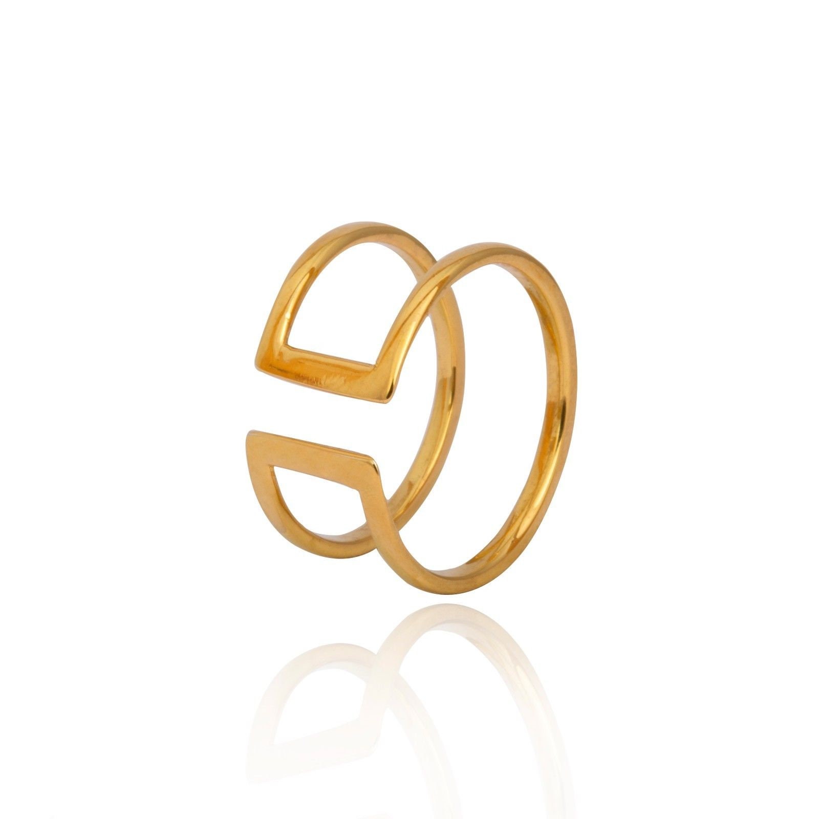 Fun and feminine, this luxurious double band cage ring makes a beautiful addition to any jewellery collection. Made from sterling silver (925) and then plated in 9ct yellow gold, this open ring is minimalist and chic, ideal for layering. Available in UK ring sizes L, P or T this ring is open at the back and so has a slight give in the size. This ring will arrive in a gift box, ready for someone special.